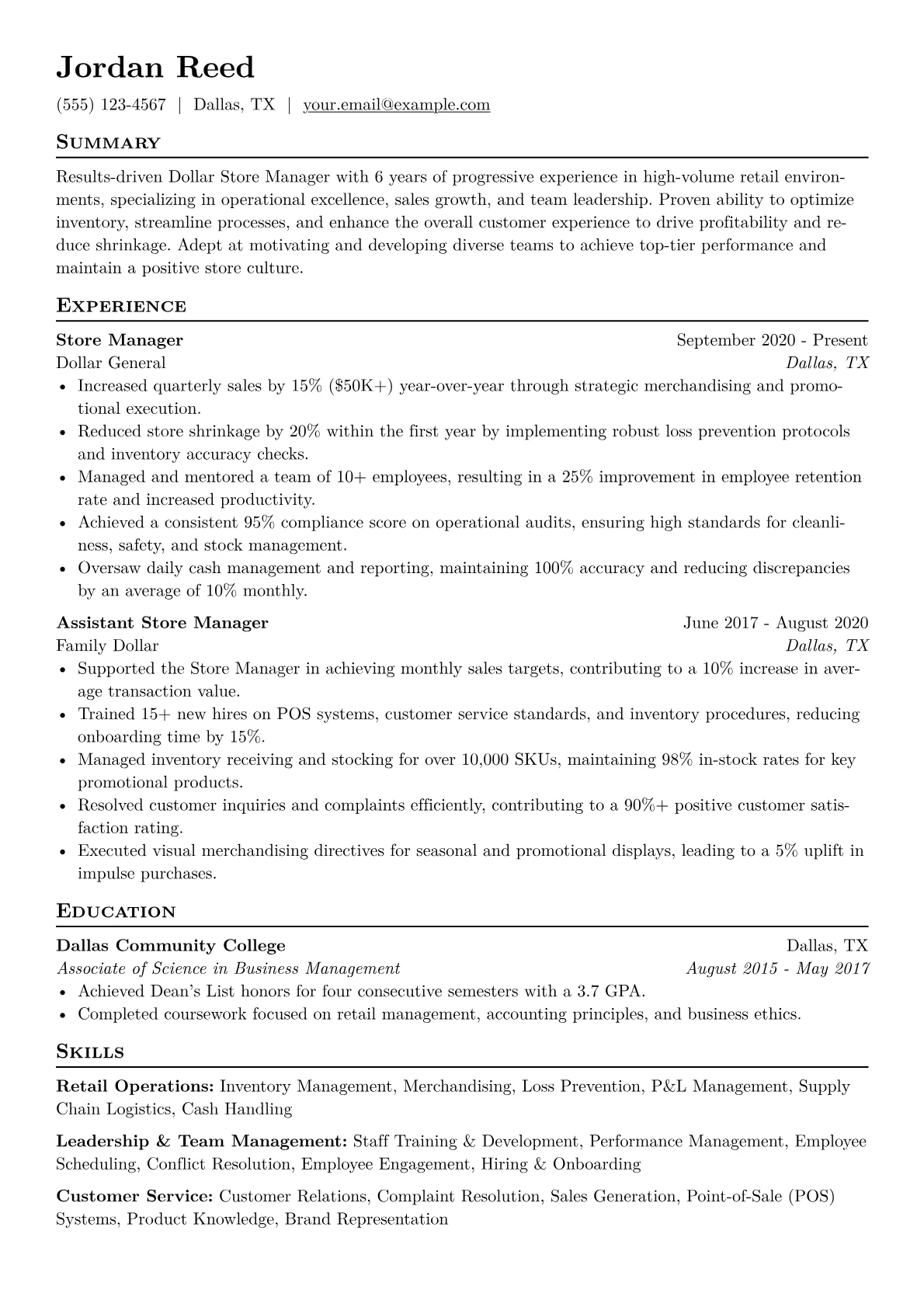 This template was built with JobSprout and can be remixed to create your own tailored Dollar Store Manager resume.