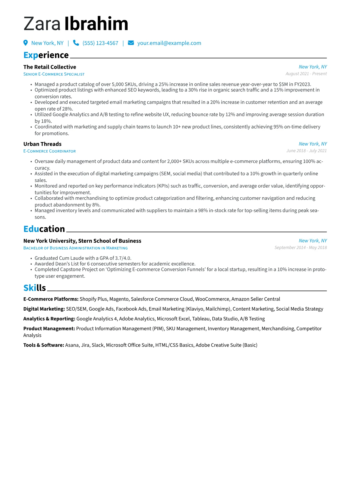 E-Commerce Specialists in the retail sector need resumes that showcase a clear, quantifiable impact on sales, conversion rates, and customer experience. Hiring managers look for candidates who can navigate complex digital ecosystems, optimize marketing funnels, and drive tangible online growth in a highly competitive and data-driven environment. Expertise in platform management, analytics, and marketing strategy is paramount.