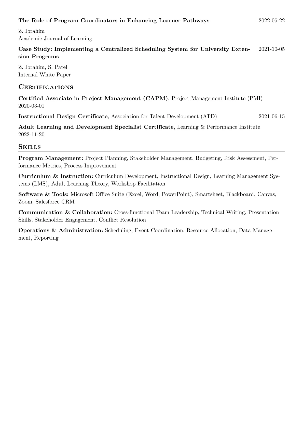 This JobSprout example effectively showcases these qualities by highlighting quantified achievements, such as improving program registration or increasing participant satisfaction. Its thoughtful skills grouping separates administrative, technical, and pedagogical competencies, making it easy for recruiters to grasp the candidate's diverse capabilities. Relevant certifications are also prominently featured, reinforcing expertise specific to educational environments.
