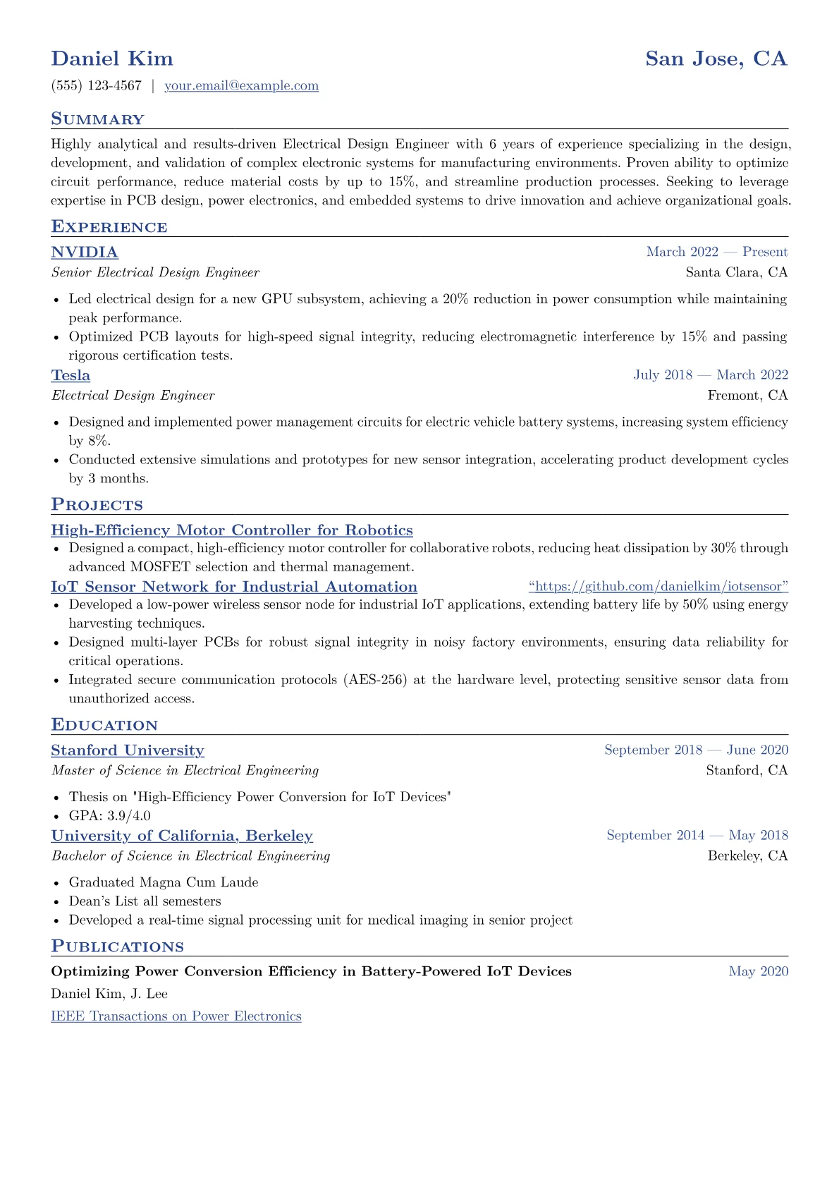 This template was built with JobSprout and can be remixed to create your own tailored Electrical Design Engineer resume. Its intuitive design allows for easy customization to reflect your unique experience.