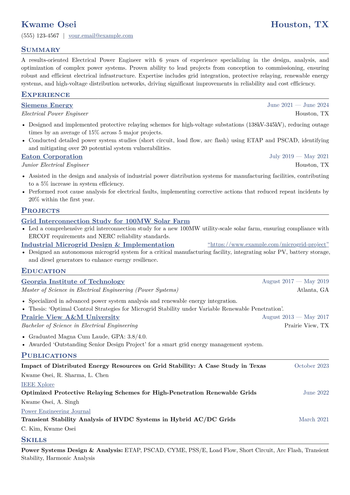 This template was built with JobSprout and can be remixed to create your own tailored Electrical Power Engineer resume. Its adaptable format ensures you can effectively showcase your unique qualifications.