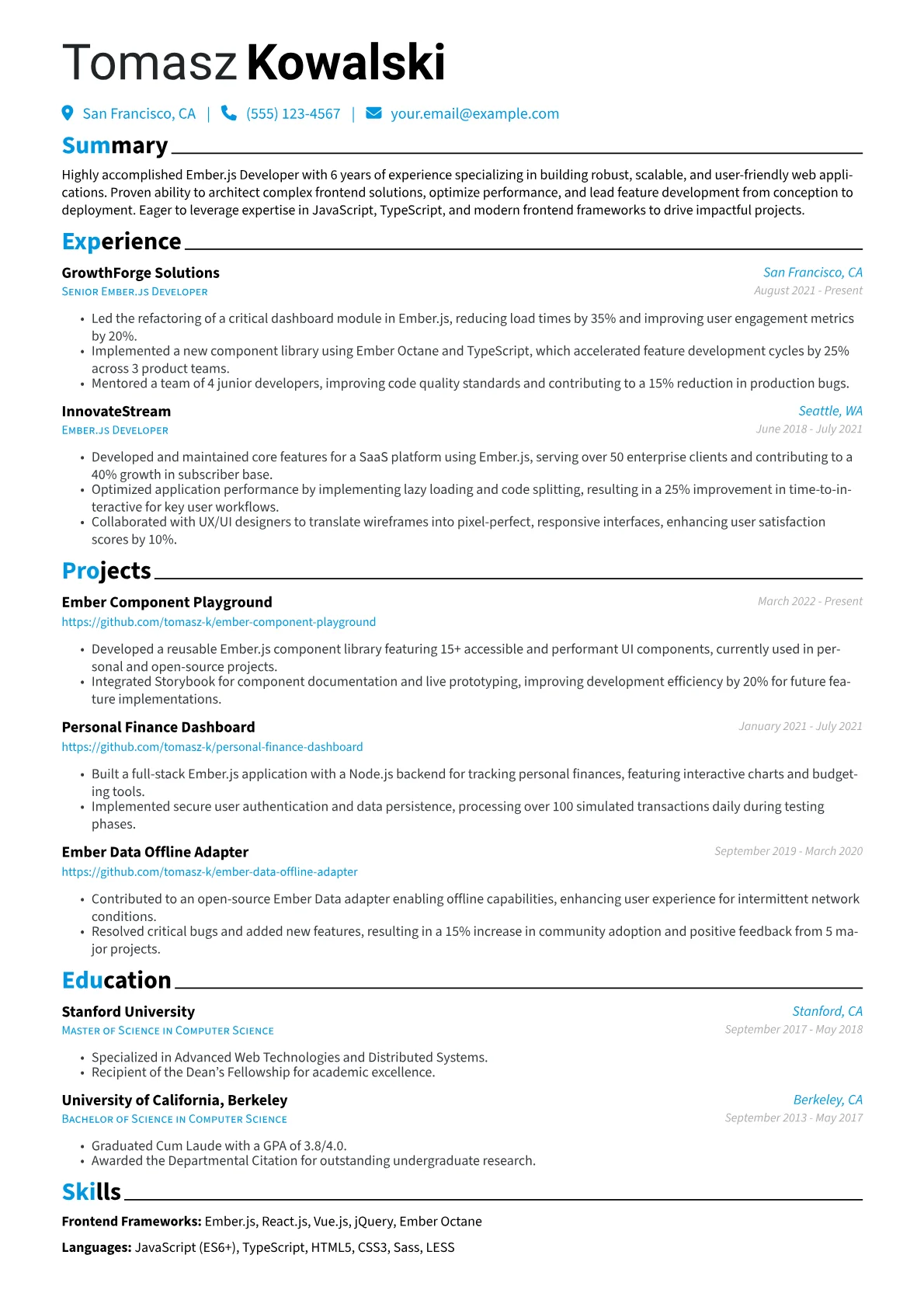 A compelling Ember.js Developer resume in the technology sector showcases deep expertise in building robust, scalable web applications. Hiring managers prioritize quantifiable achievements demonstrating impact, such as optimizing application performance with FastBoot or service workers, or leading migrations from older frameworks to modern Ember.js using Glimmer components. Concrete examples of contributions to complex Ember Data models, custom addon development, or implementing advanced state management patterns truly stand out. Emphasizing experience with test driven development using tools like Ember QUnit or Cypress, and familiarity with modern JavaScript features, signal a candidate's readiness for mid-level challenges.