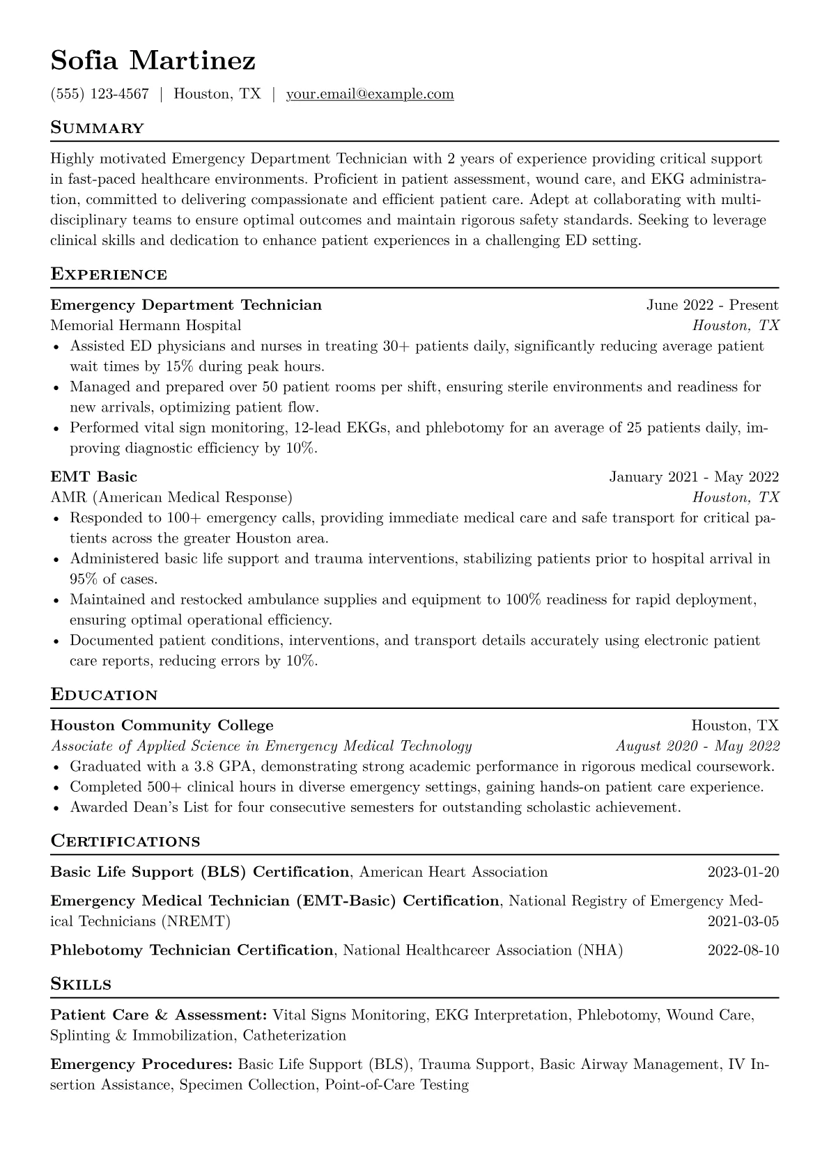 This robust template was thoughtfully built with JobSprout. It can be easily remixed to create your own tailored Emergency Department Technician resume.