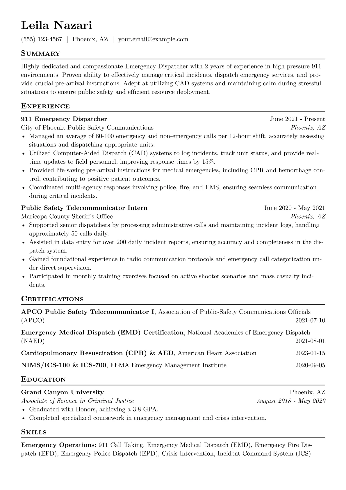 This template was built using JobSprout and can be remixed to create your own tailored Emergency Dispatcher resume. Optimize it to reflect your unique skills and experience.