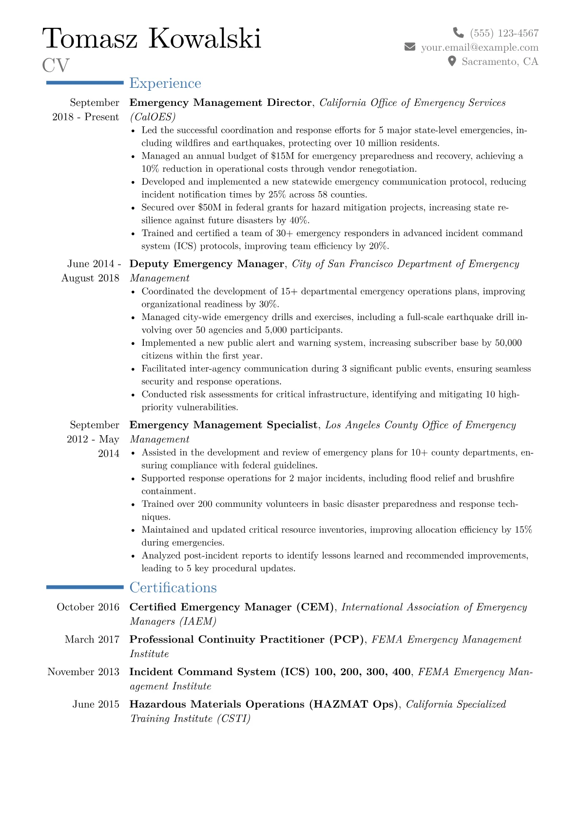 This exceptional template was expertly crafted using JobSprout's professional CV builder. You can easily remix this framework to tailor your own impactful Emergency Management Director resume.