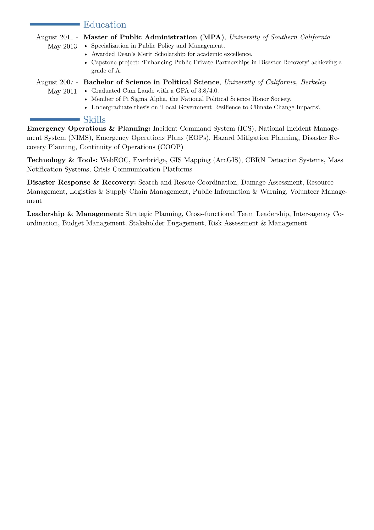 This example effectively highlights critical skills through well-placed sections and quantified achievements. Notice how certifications like Certified Emergency Manager (CEM) and specific FEMA accreditations are prominently featured, signaling deep industry knowledge. The resume adeptly groups key competencies such as incident command, risk assessment, and stakeholder engagement, making a candidate's diverse capabilities immediately clear.