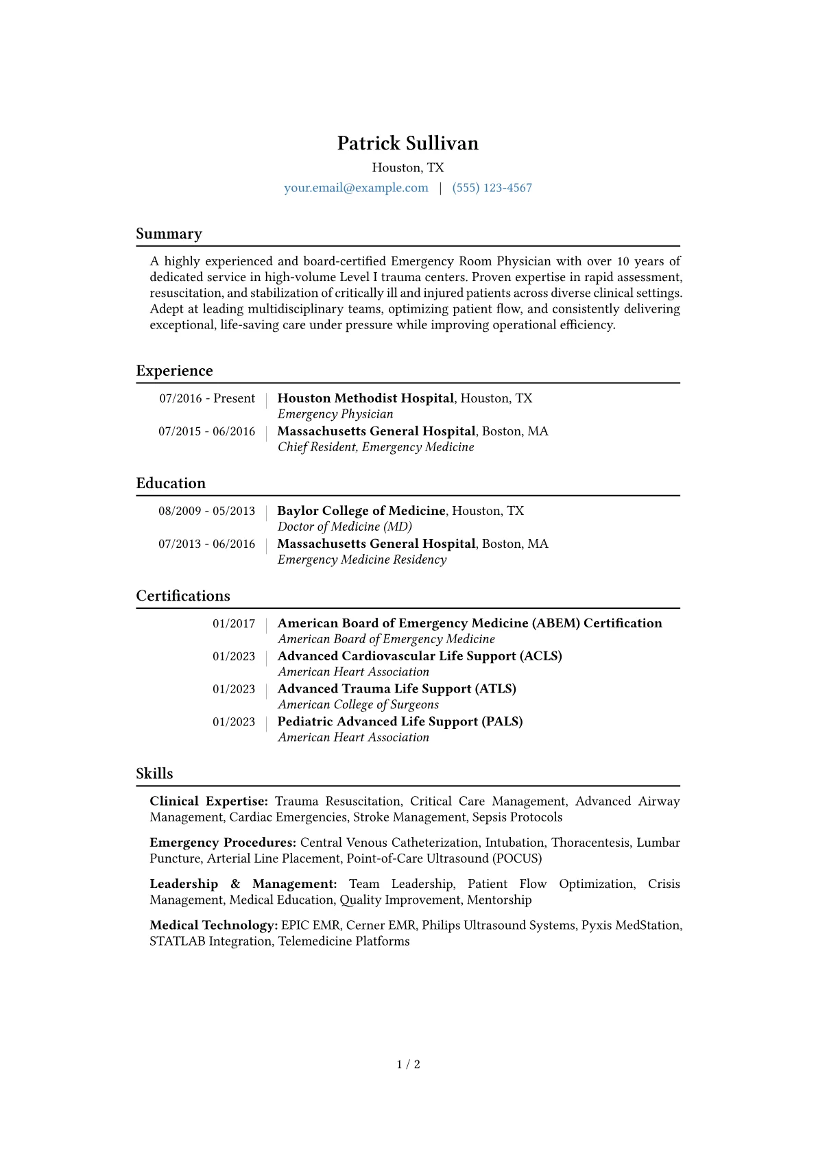 This example CV excels at showcasing these critical physician attributes. Achievements are clearly quantified, such as reducing patient wait times by a specific percentage or managing a high volume of critical care cases daily. Clinical and professional skills are effectively grouped, separating acute procedural capabilities like intubation and POCUS from essential soft skills like interdisciplinary collaboration and crisis management. Certifications like ABEM, ACLS, and ATLS are prominently highlighted, reassuring recruiters of immediate clinical readiness and adherence to industry standards.