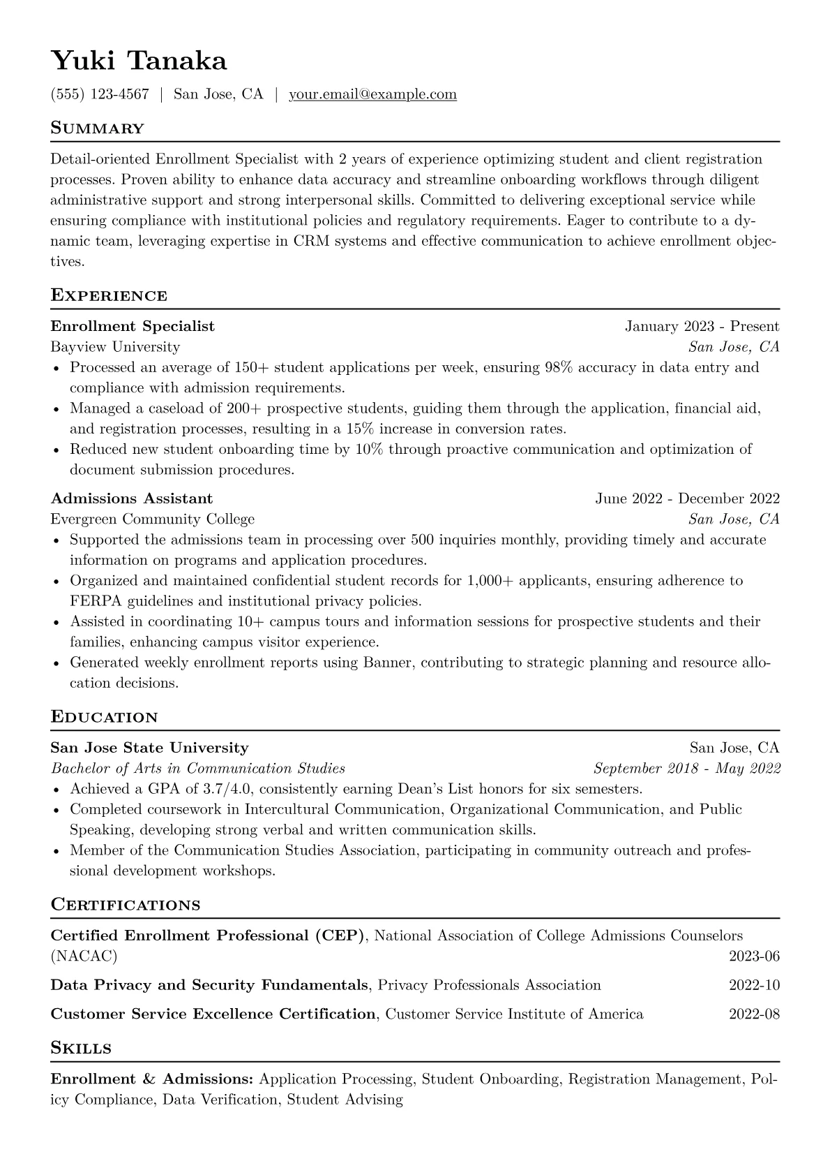 This template was built with JobSprout and can be remixed to create your own tailored Enrollment Specialist resume.