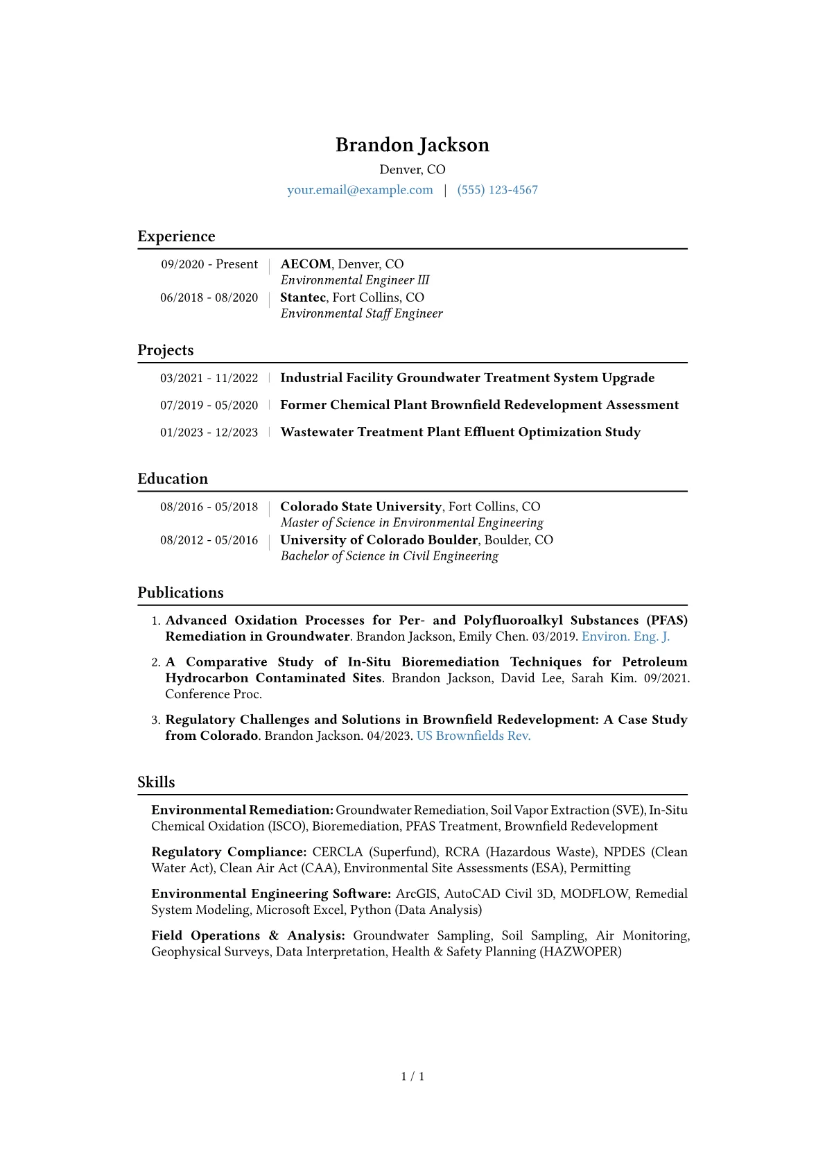 This robust template was thoughtfully built using JobSprout's professional CV builder. You can easily remix this example to create a personalized resume that stands out in the competitive environmental engineering field.