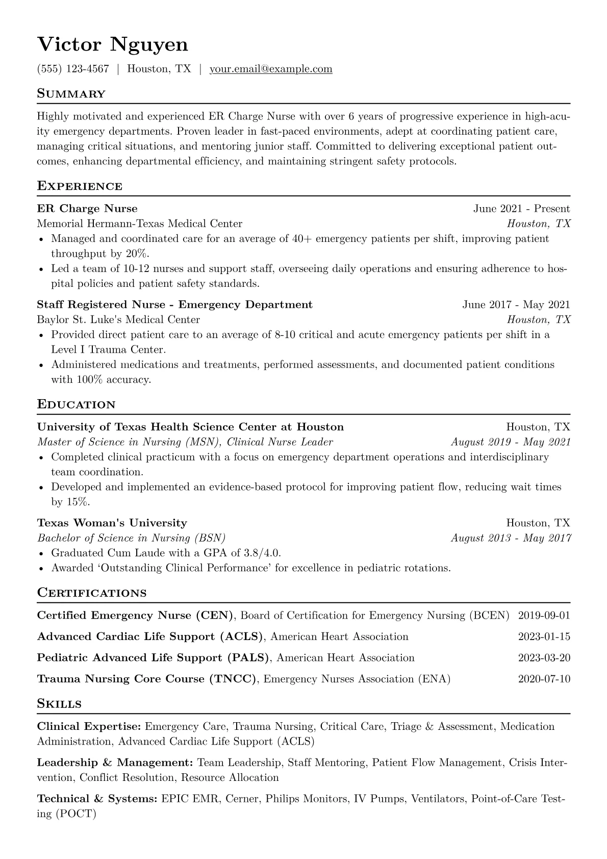 For an ER Charge Nurse, a compelling resume articulates leadership in high-pressure, fast-paced environments. Hiring managers prioritize demonstrable impact on patient flow, emergency response coordination, and staff management. Key achievements often include streamlining triage protocols, reducing door-to-provider times, or leading rapid response teams during critical incidents. Expertise in advanced cardiac life support (ACLS), pediatric advanced life support (PALS), and trauma nursing core course (TNCC) certifications is essential, alongside proficiency in electronic health record (EHR) systems like Epic or Cerner. The resume must convey adeptness in interdisciplinary collaboration, patient safety initiatives, and regulatory compliance.