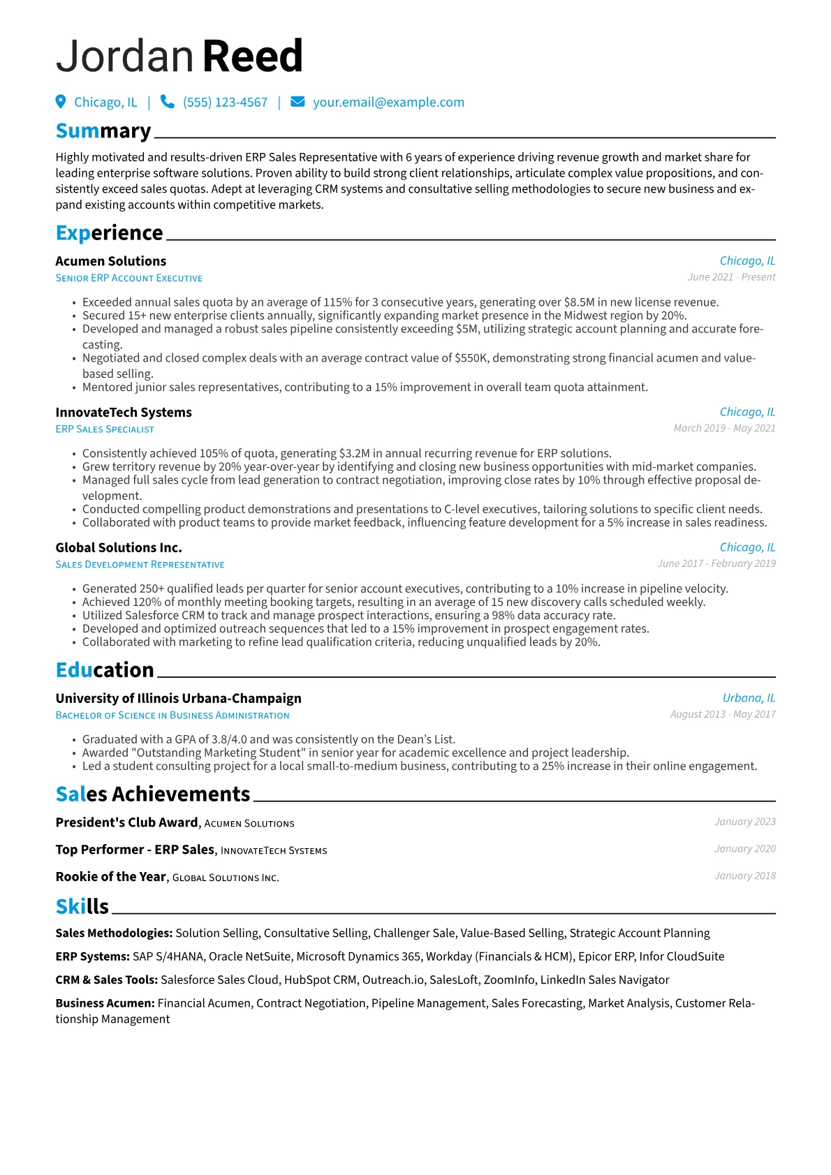 This template was built with JobSprout and can be remixed to create your own tailored ERP Sales Representative resume. It provides a solid foundation for presenting your unique qualifications.