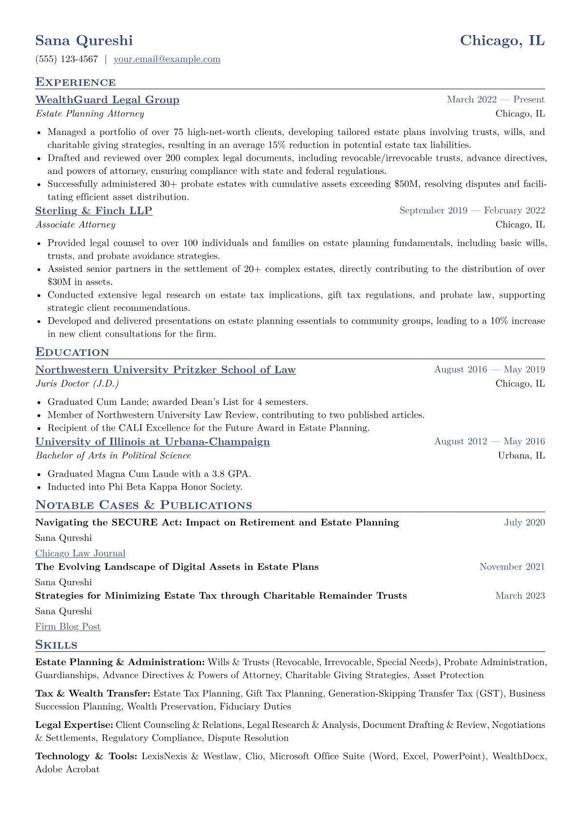 For an Estate Planning Attorney, a strong resume meticulously details experience with wills, trusts, probate, and tax implications, demonstrating both legal acumen and a client-focused approach. Hiring managers in the legal sector seek candidates who can navigate complex regulations while building sensitive client relationships, often looking for specific experience with estate administration, elder law, and charitable giving. The unique challenge lies in showcasing technical legal expertise alongside strong communication and empathy.