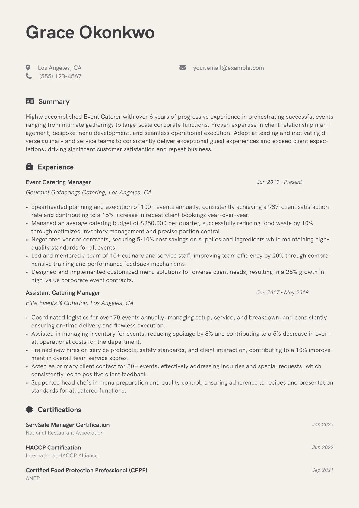 A strong Event Caterer resume for mid-level professionals emphasizes a blend of culinary expertise, meticulous logistical planning, and exceptional client management. Hiring managers seek evidence of successful event execution across various scales, often looking for achievements like maintaining high client satisfaction scores or managing budgets effectively for events ranging from intimate gatherings to large corporate functions. Demonstrating proficiency in menu customization, inventory management, and strict adherence to food safety standards, perhaps with a ServSafe Manager certification, is crucial. Experience with diverse dietary requirements and vendor coordination also highlights a well-rounded candidate prepared for the dynamic challenges of event catering.