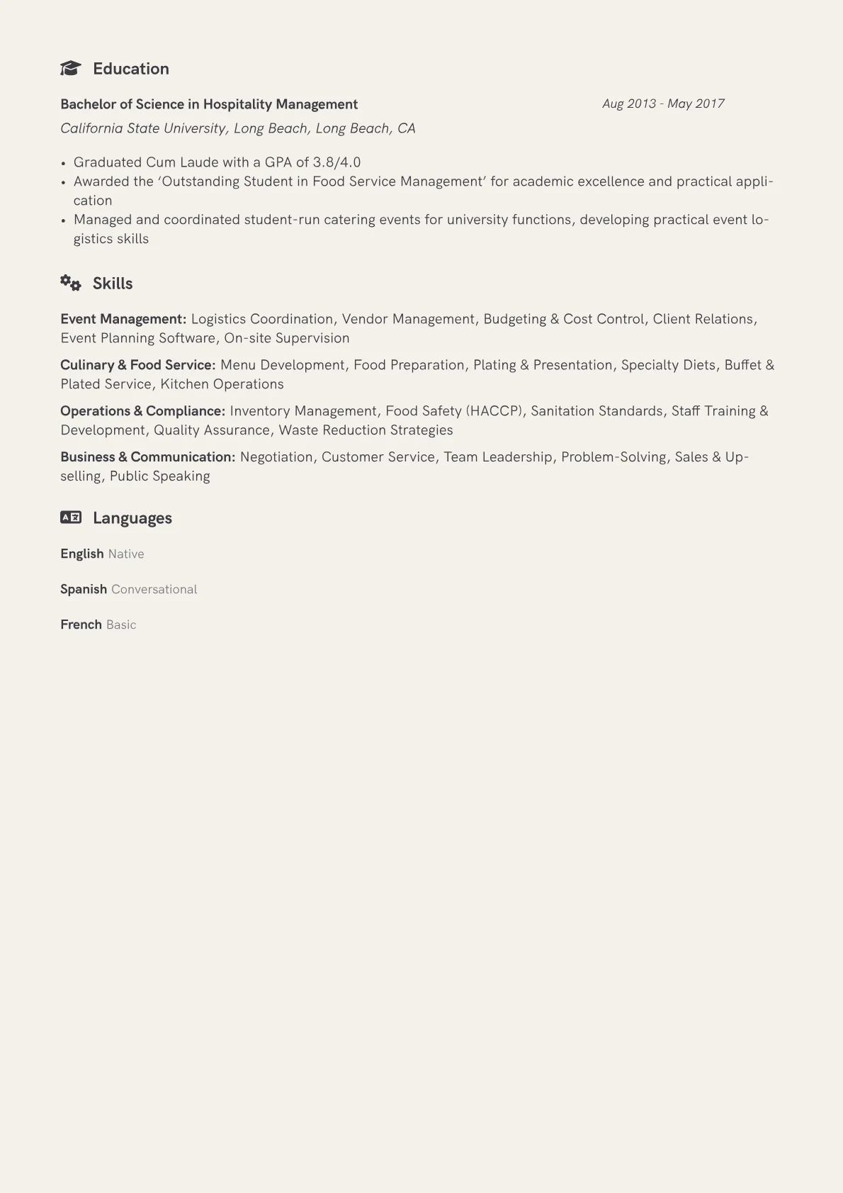 This example CV effectively showcases these critical elements. It quantifies achievements by detailing the number of events managed or the percentage by which client satisfaction improved under their supervision, providing tangible proof of impact. Skills are logically grouped under headings such as "Event Operations," "Culinary Leadership," and "Client Relations," making key competencies immediately apparent. Crucial industry certifications, like ServSafe, are prominently displayed, alongside proficiency in relevant catering software or inventory systems, signaling readiness for operational demands.