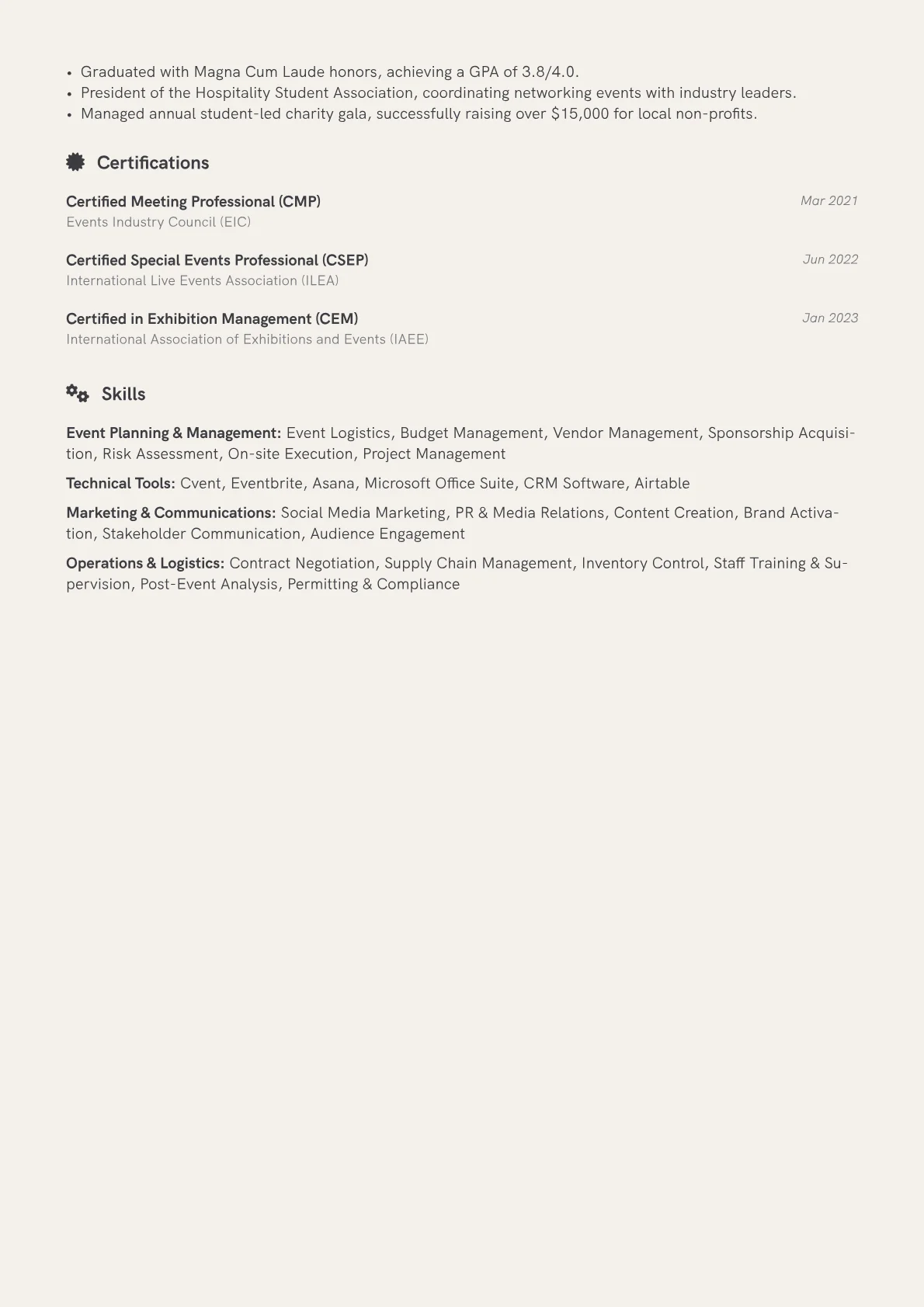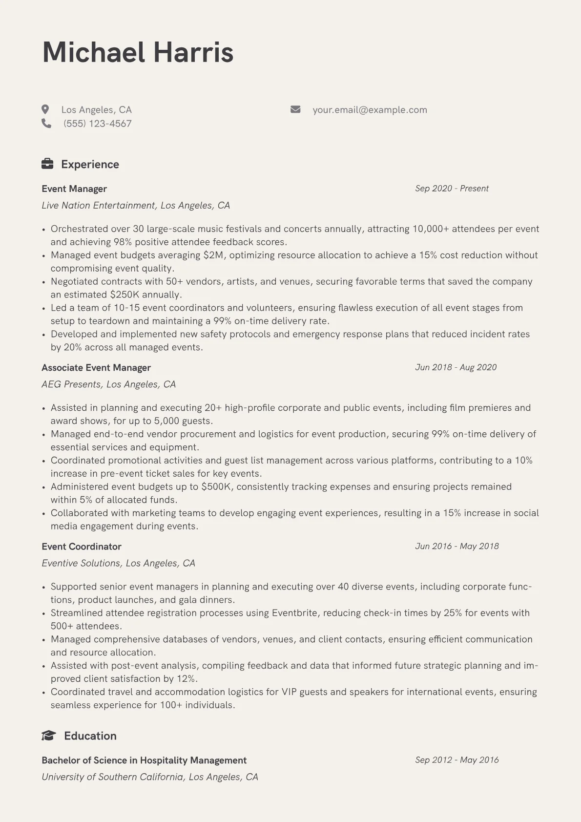 A strong Event Manager resume for the Media & Entertainment industry highlights proven ability to deliver high-impact experiences and manage complex logistics under pressure. Hiring managers seek evidence of successful event execution from concept to completion, exceptional vendor and stakeholder management, and a track record of creating memorable, brand-aligned events. The unique challenges of this sector demand candidates who can adapt to dynamic environments while ensuring flawless delivery and audience engagement.