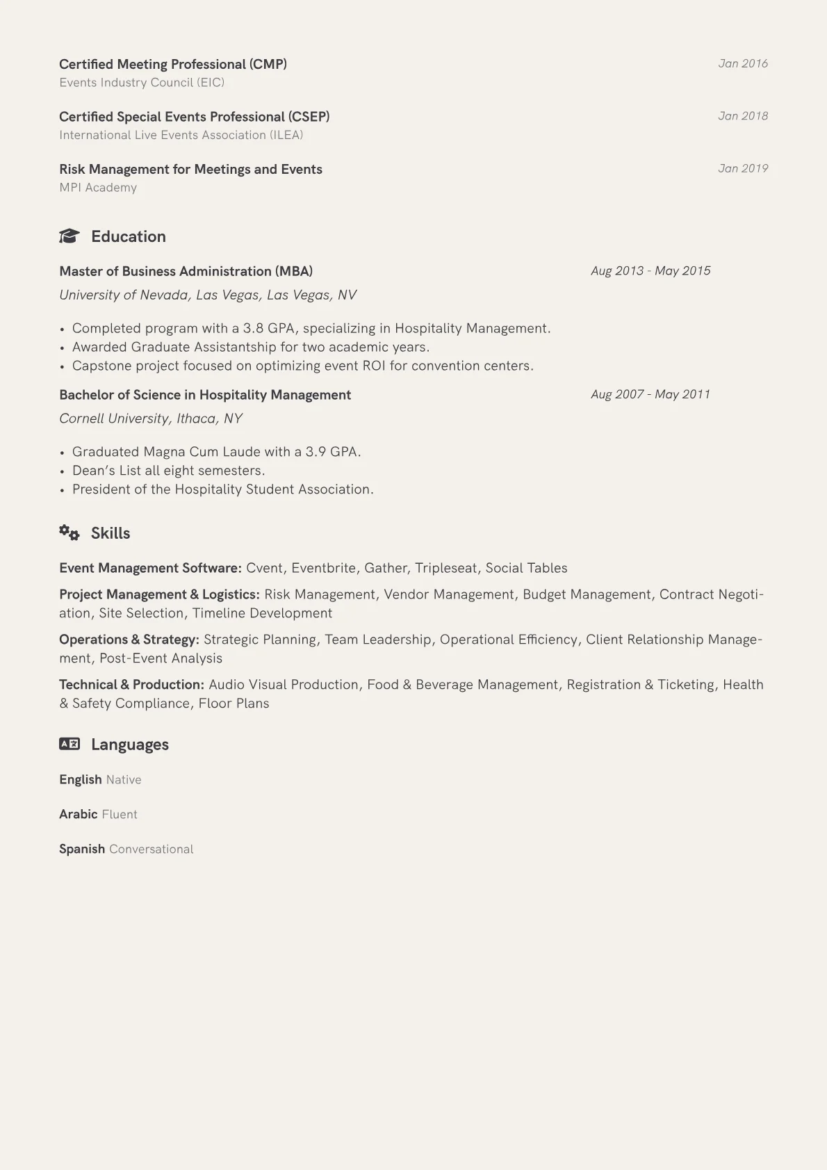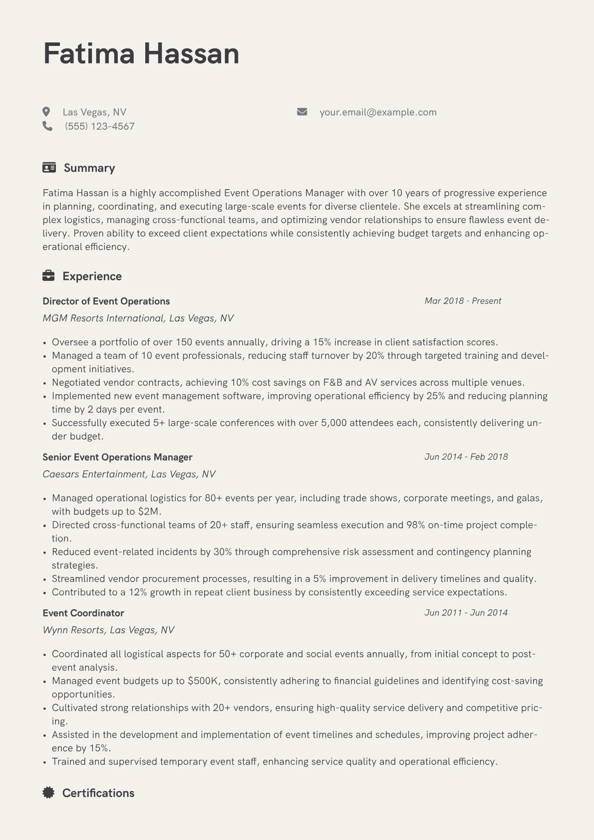This template was built with JobSprout and can be remixed to create your own tailored Event Operations Manager resume. It provides a solid framework for presenting your senior-level expertise.