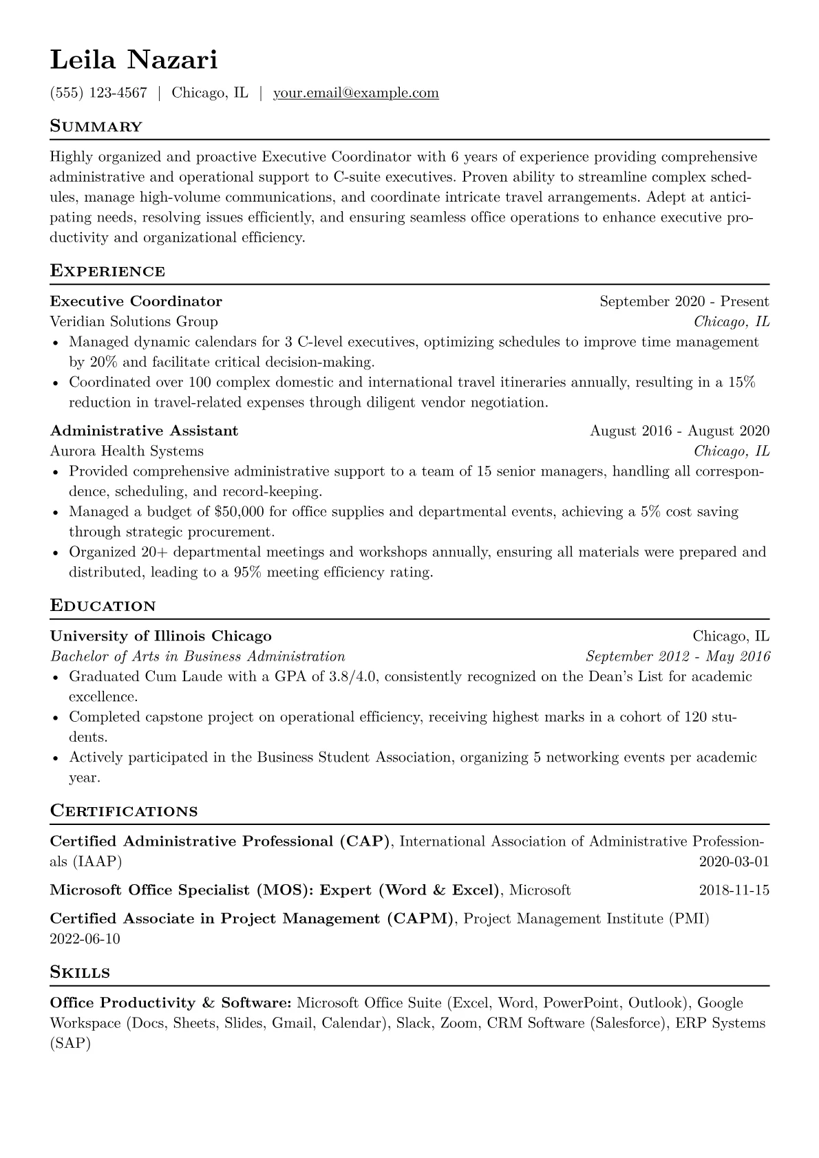 For an Executive Coordinator in a dynamic industry, a compelling resume highlights proactive administrative support and strategic organizational capabilities. Hiring managers seek candidates who demonstrate exceptional discretion, adept calendar management for multiple executives, and the ability to anticipate needs. Concrete achievements might include streamlining complex scheduling processes, resulting in fewer conflicts, or coordinating multi-departmental projects from inception to completion. Proficiency with specific CRM systems, project management software like Asana or Trello, and advanced presentation tools is often expected.