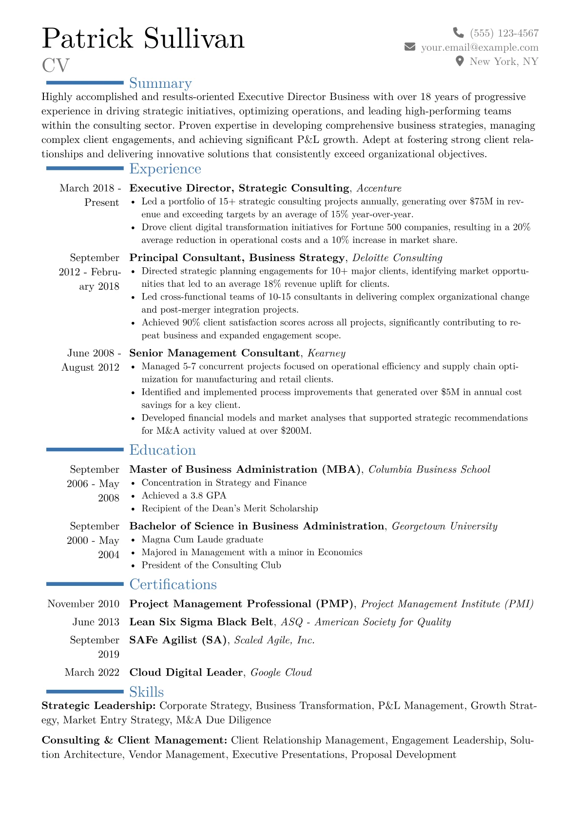 This example CV excels by featuring robustly quantified achievements that highlight direct business outcomes rather than just responsibilities. Skills are strategically grouped under headings like "Strategic Operations Leadership," "Client Relationship Management," and "Financial Stewardship," making key competencies immediately apparent. Crucially, the resume details specific methodologies and tools relevant to executive-level operations consulting, from enterprise resource planning systems to advanced analytics platforms, reinforcing expertise without relying on vague descriptors. It articulates a career progression defined by increasing responsibility and measurable success in driving client value.