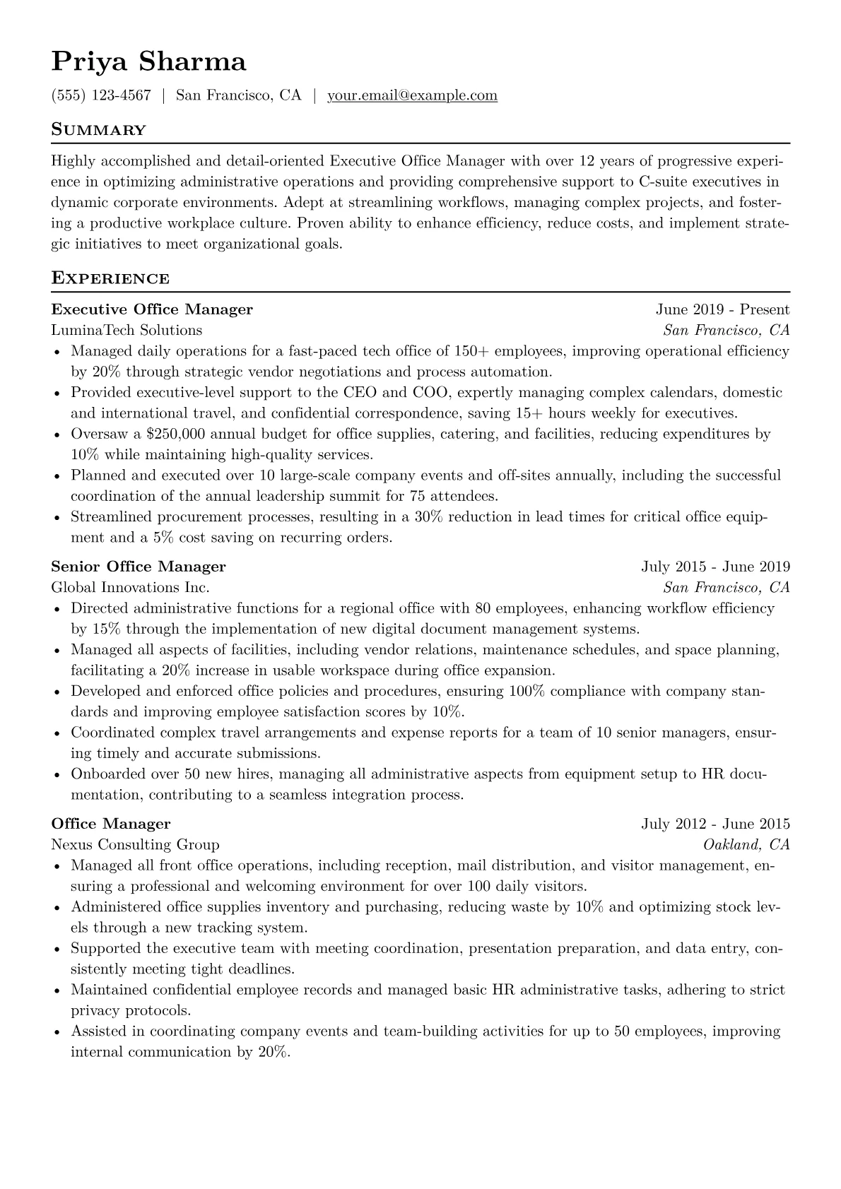 This template was built with JobSprout and can be remixed to create your own tailored Executive Office Manager resume.