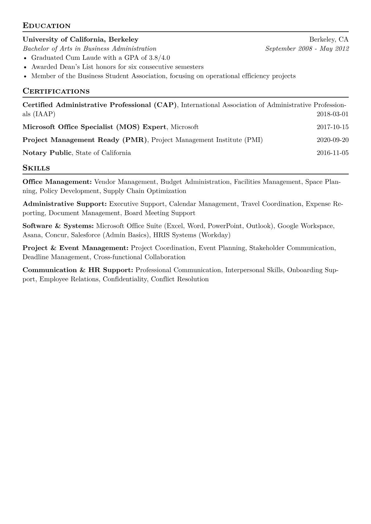 The JobSprout example effectively highlights these critical aspects through its structure. Quantified accomplishments immediately convey impact, such as "reduced vendor expenses by 18%" or "orchestrated 15+ company events for up to 200 attendees." Skills are thoughtfully categorized into areas like "Operational Oversight," "Executive Liaison," and "Systems Management," demonstrating a holistic understanding of the role. Important certifications and advanced proficiencies in tools like SharePoint, Asana, or HRIS platforms are prominently featured, assuring employers of technical readiness and professional development.
