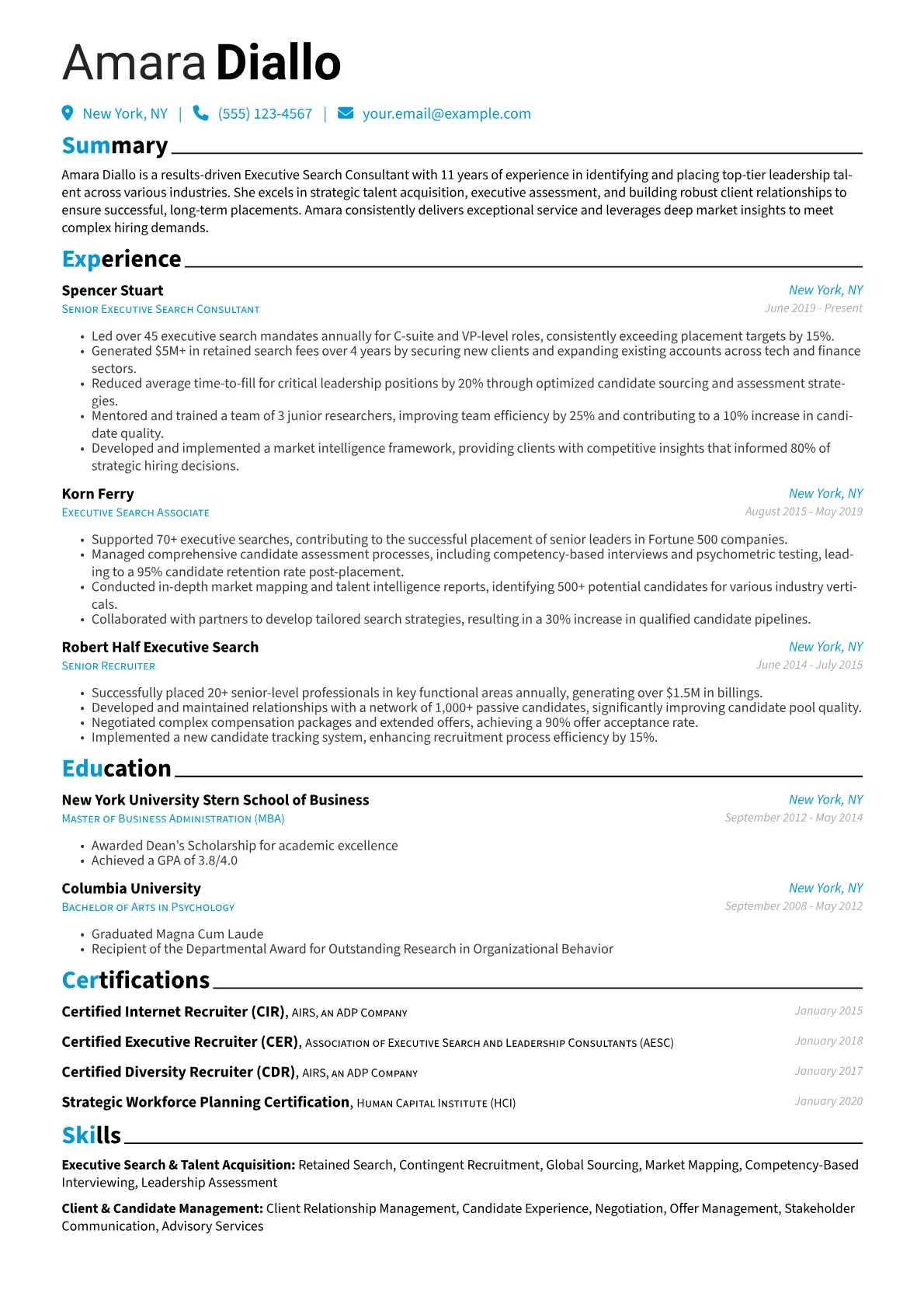 For an Executive Search Consultant operating within diverse "Other" industries, hiring managers critically evaluate a resume for specific, high-impact achievements. They seek concrete evidence of successful senior-level placements, deep market intelligence, and robust client relationship management. Nuances include the ability to navigate varied organizational cultures and industry specific challenges. Key achievements should quantify outcomes such as reduced time-to-hire for critical C-suite or VP-level positions, expansion of client portfolios, or successful placements in challenging niche markets. Certifications like CIR or CDR, alongside expertise in compensation analysis and talent mapping, are highly valued.