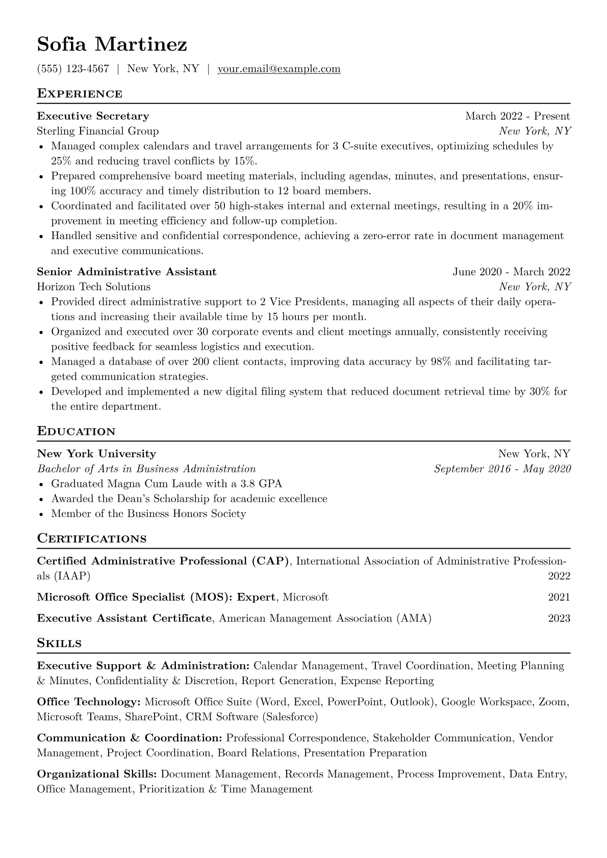 This effective template was built with JobSprout and can be easily remixed to craft your own standout Executive Secretary resume.