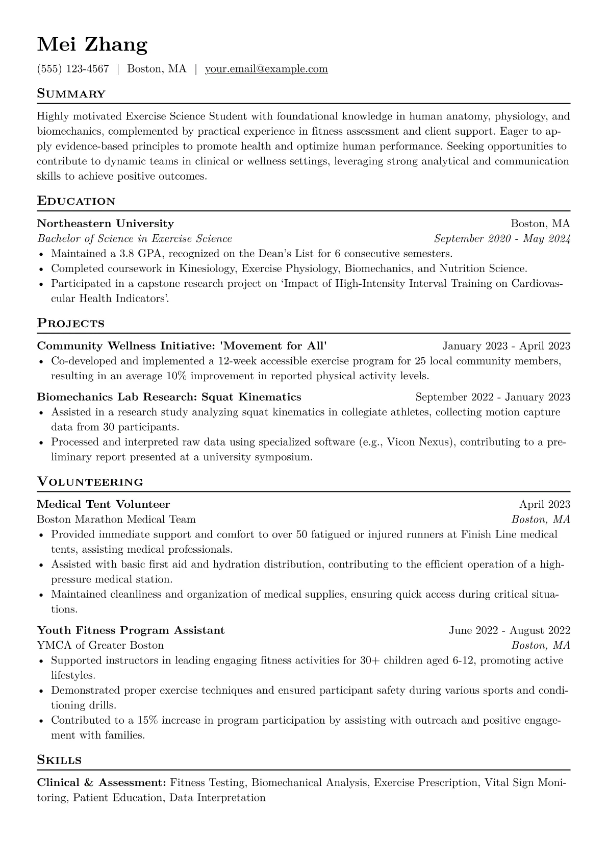 To create an impactful Exercise Science Student resume, applicants must emphasize practical application of theoretical knowledge. Hiring managers seek evidence of hands-on experience in areas like physiological assessment, exercise program design, and client education. Concrete achievements that demonstrate the ability to analyze human movement, interpret data from fitness testing (e.g., VO2 max, body composition), and contribute to evidence-based practice are crucial. Certifications such as ACSM Certified Personal Trainer (CPT) or NSCA Certified Strength and Conditioning Specialist (CSCS), alongside CPR/AED, are often expected and should be prominently displayed.