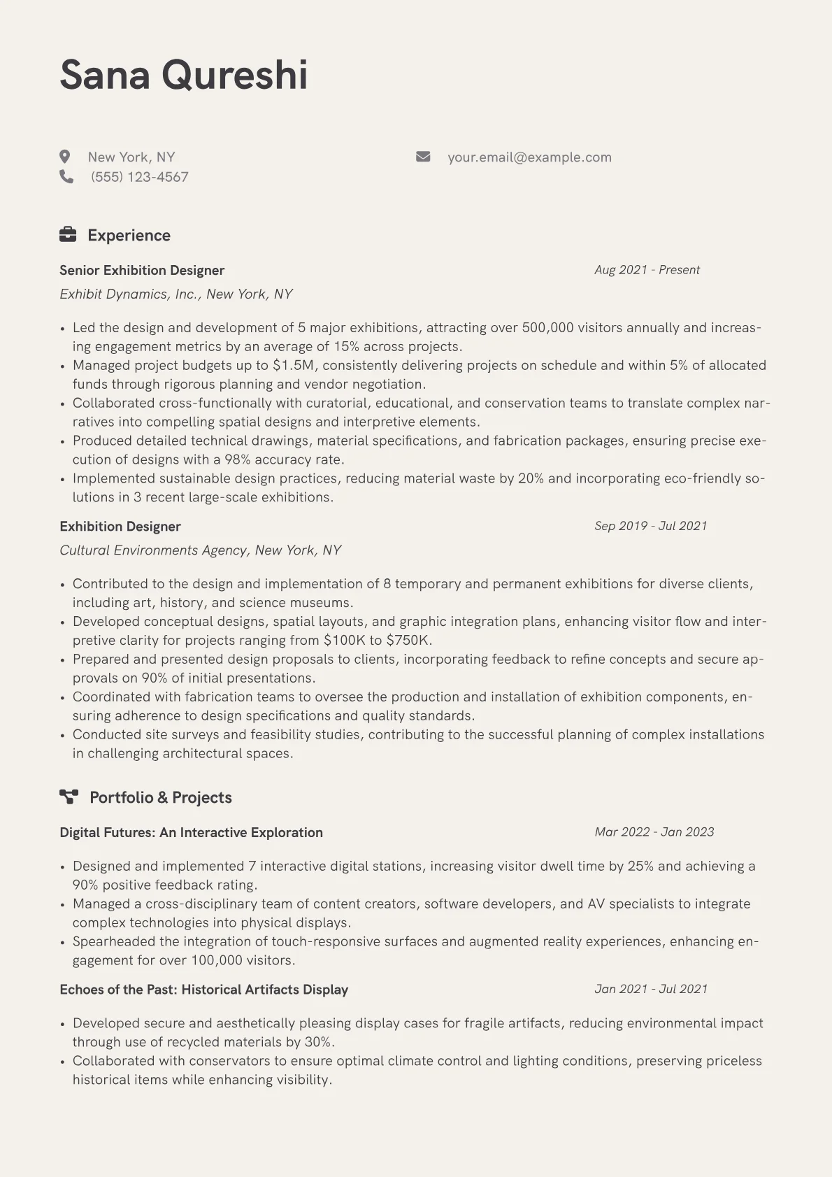 This versatile template was expertly built using JobSprout and can be easily remixed to create your own compelling Exhibition Designer resume, tailored to your unique experience and career aspirations.