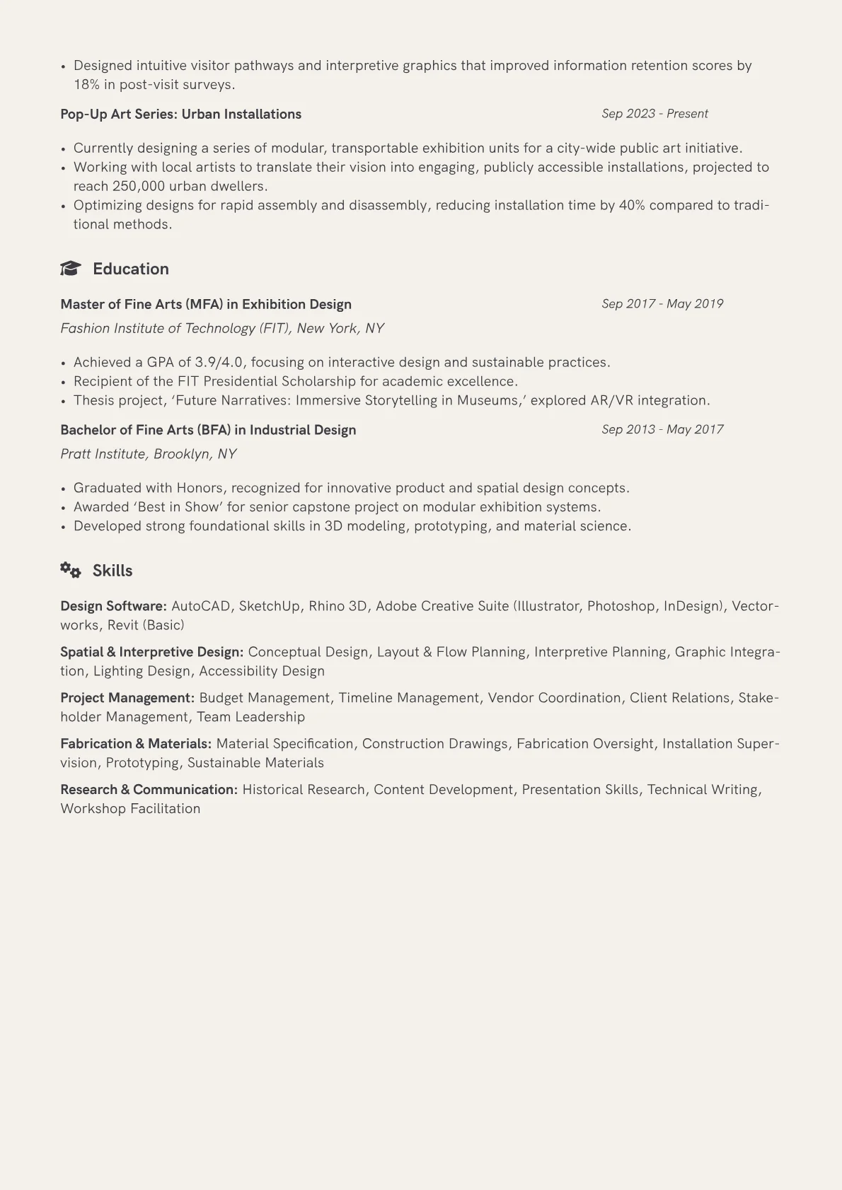 This example excels by clearly segmenting skills, highlighting a blend of conceptual design, technical software proficiency, and project management acumen. Quantified achievements, such as specific project sizes or visitor engagement metrics, effectively demonstrate impact and scope. This structure allows hiring managers to quickly grasp the candidate's ability to translate narratives into physical and digital environments.