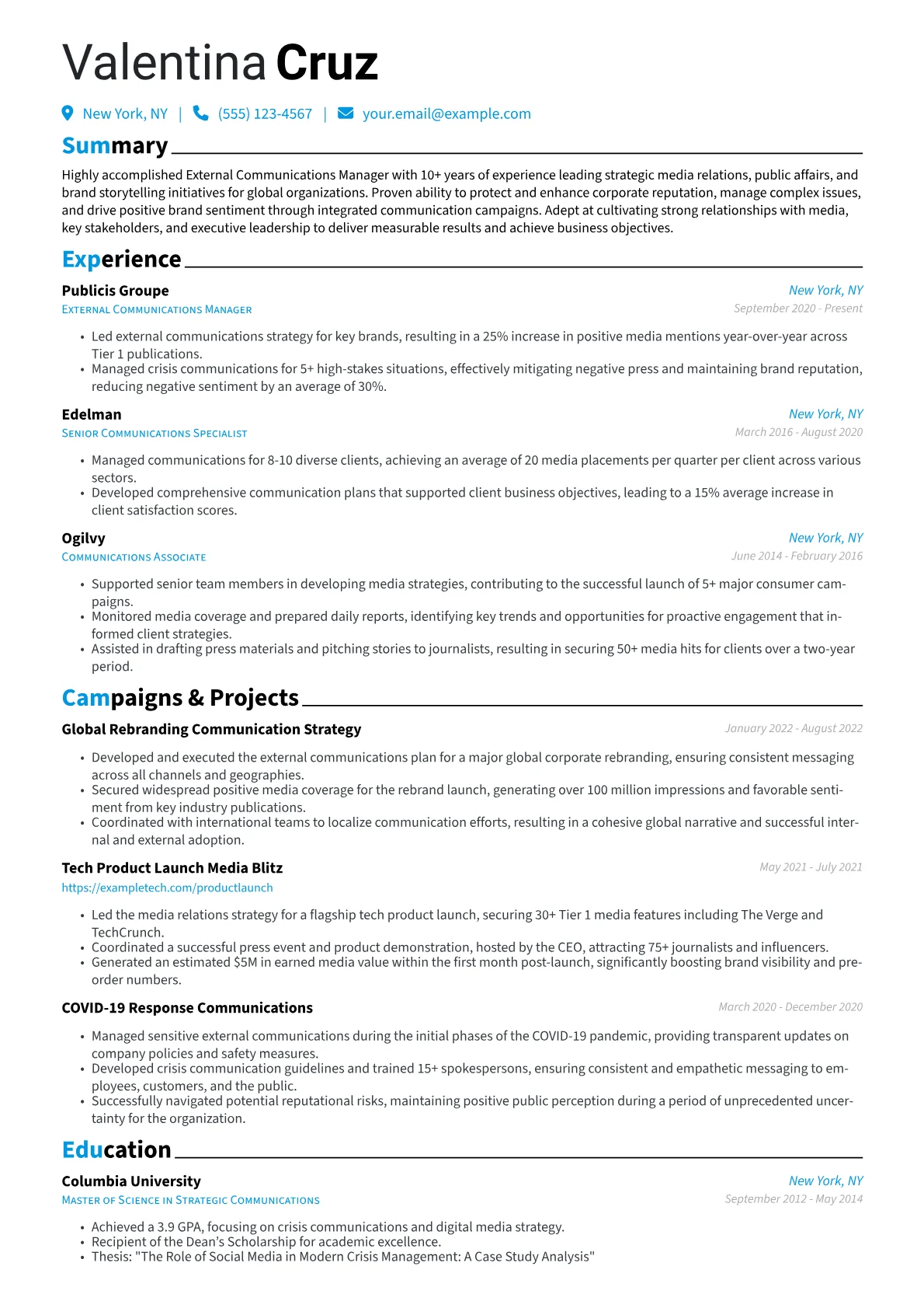 This example CV effectively highlights an External Communications Manager's expertise. Achievements are clearly quantified, detailing specific outcomes like a "25% increase in media placements" or "managed five high-profile crisis communications events." Skills are logically grouped into categories such as "Media Relations & PR Strategy" and "Digital Communications," providing immediate insight. Crucially, certifications like an APR and proficiency in industry-specific tools such as Google Analytics, Cision, and Mailchimp are prominently displayed, assuring recruiters of comprehensive capabilities in a senior role.