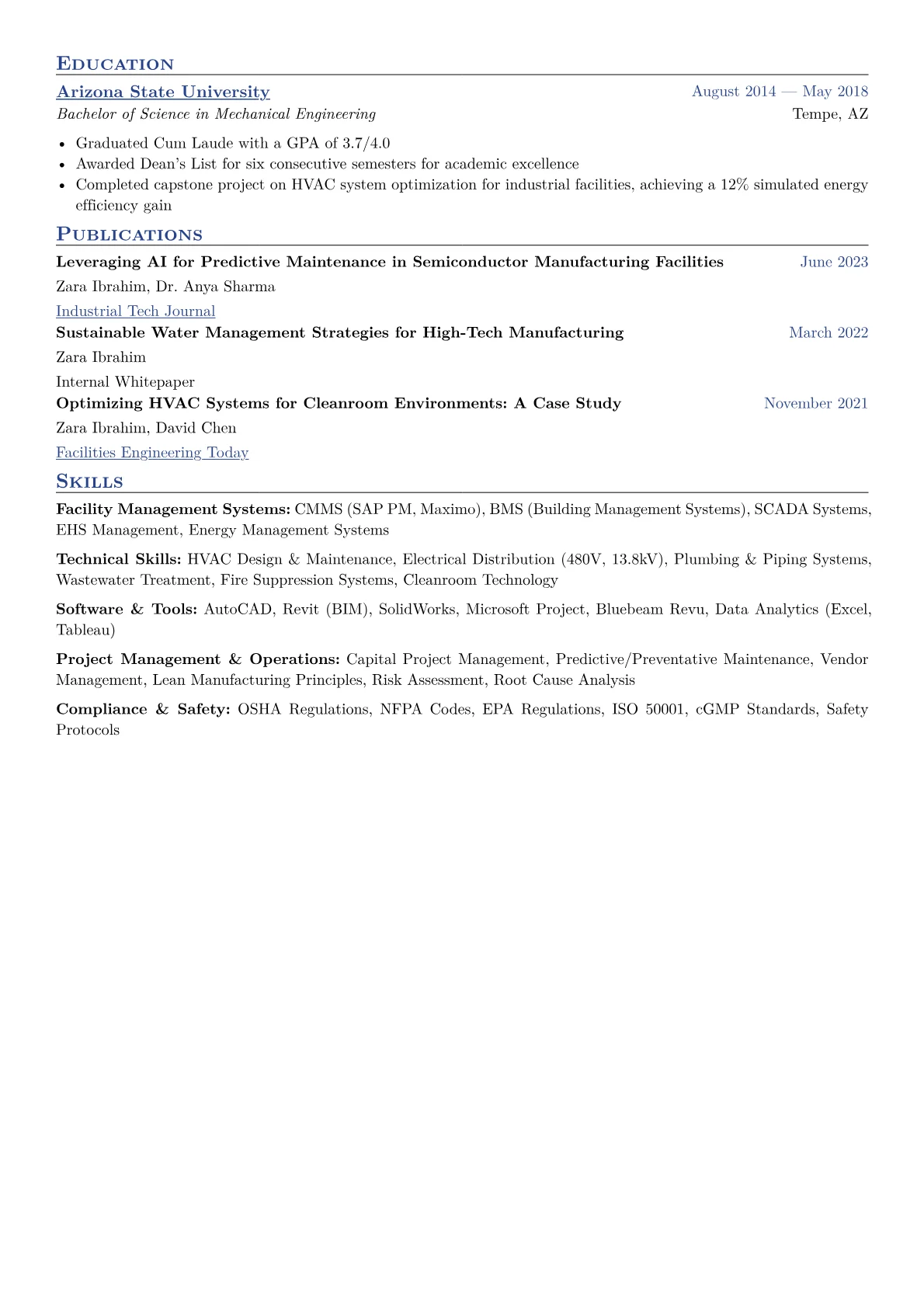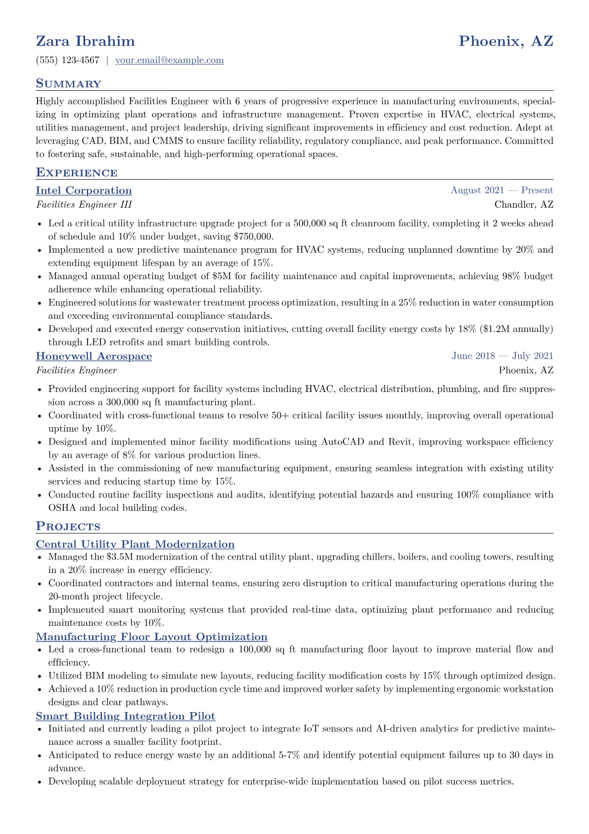 For a mid-level Facilities Engineer in manufacturing, hiring managers prioritize clear evidence of operational uptime, cost reduction, and regulatory compliance. Strong resumes feature achievements like optimizing utility systems, managing preventative maintenance programs, or spearheading capital improvement projects that directly impact production efficiency. Relevant certifications such as OSHA 30, CEM, or specific CMMS software proficiency, alongside terms like root cause analysis, lean manufacturing, and TPM, signal immediate value in a dynamic production environment.