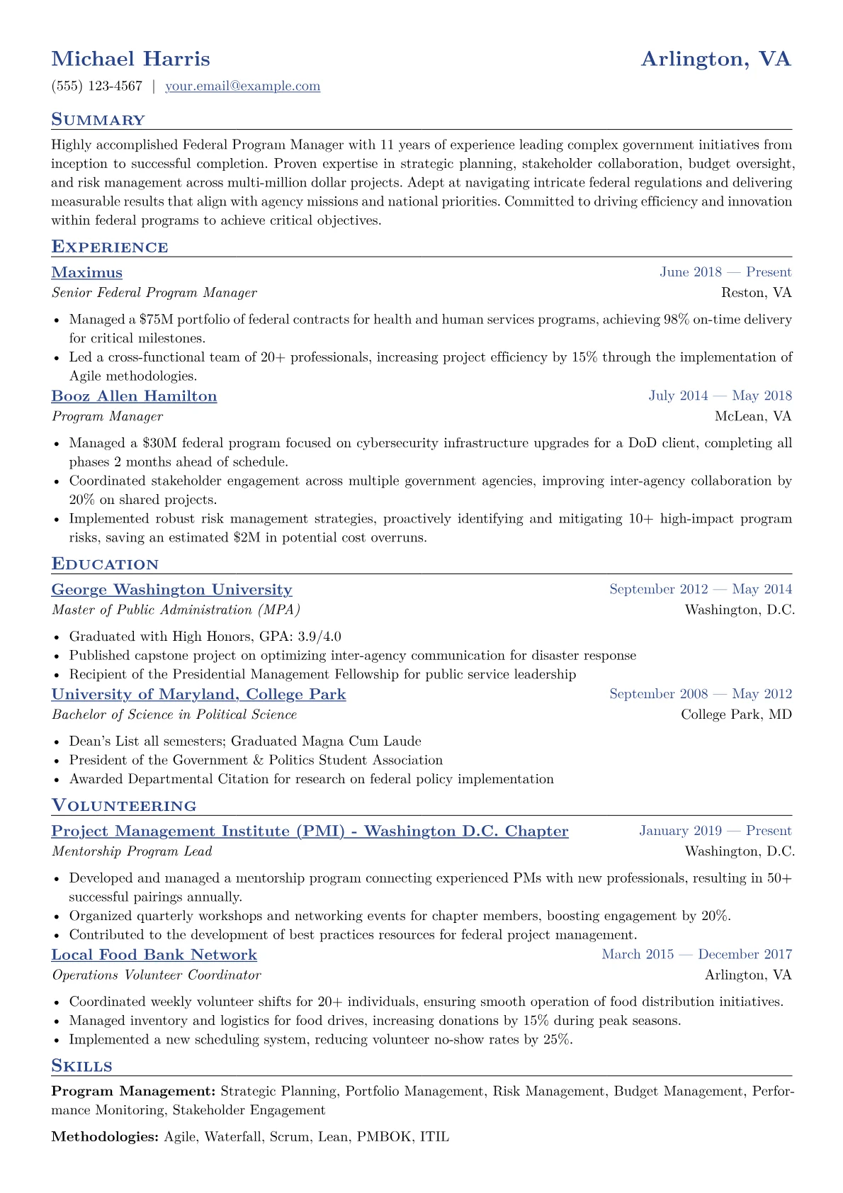 This template was built with JobSprout and can be remixed to create your own tailored Federal Program Manager resume.