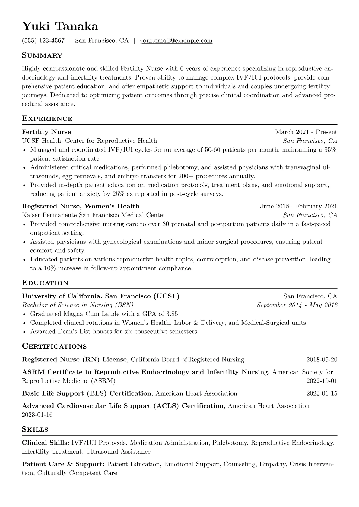 This template was built with JobSprout and can be remixed to create your own tailored Fertility Nurse resume.