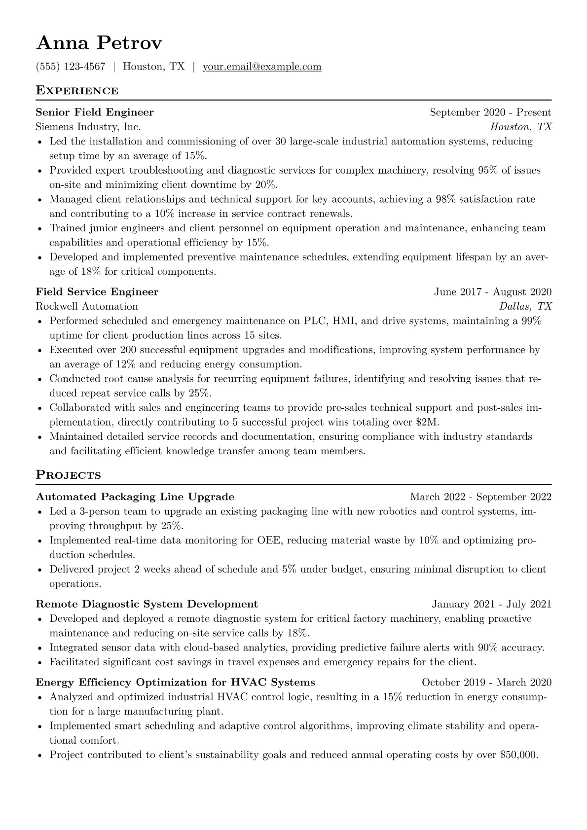 A strong Field Engineer resume for the manufacturing industry effectively highlights hands-on technical troubleshooting, problem-solving abilities, and client site management. Hiring managers in this sector seek candidates who can demonstrate a clear impact on operational efficiency, safety compliance, and equipment uptime. The unique challenge is conveying adaptability across diverse manufacturing environments and complex system diagnostics.