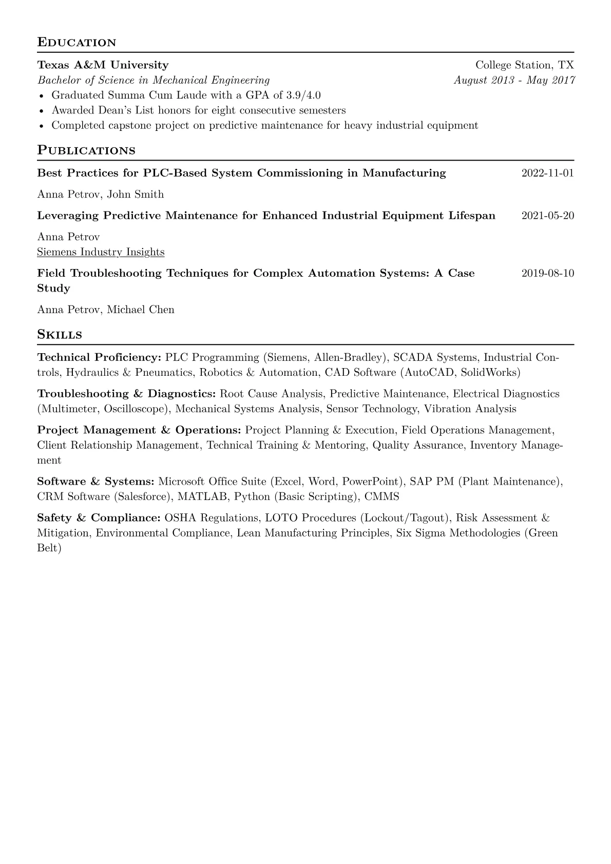This JobSprout example excels by showcasing quantified achievements, such as specific percentages for downtime reduction or efficiency improvements. It strategically groups critical technical skills, making specialized expertise immediately visible, and highlights relevant industry certifications vital for manufacturing roles. The clear, concise layout effectively communicates a candidate's value.
