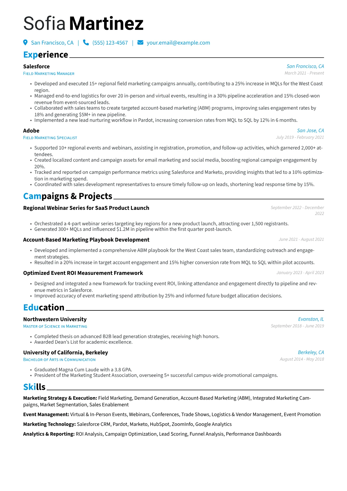 A strong Field Marketing Manager resume effectively showcases a candidate's ability to drive regional growth and pipeline generation through localized campaigns and events. Hiring managers in Marketing & Advertising seek demonstrable impact on lead generation, sales enablement, and brand awareness within specific territories. The unique challenge for Field Marketing Managers is translating diverse activities like event planning, partner marketing, and localized content into measurable business outcomes.