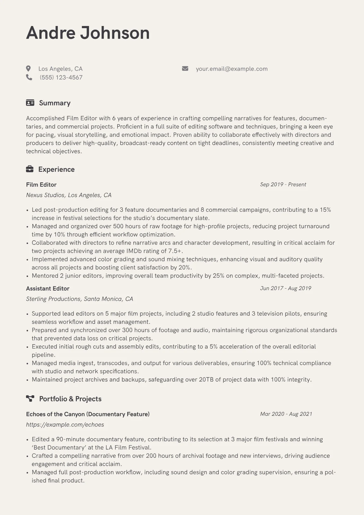 This template was built with JobSprout and can be remixed to create your own tailored Film Editor resume.