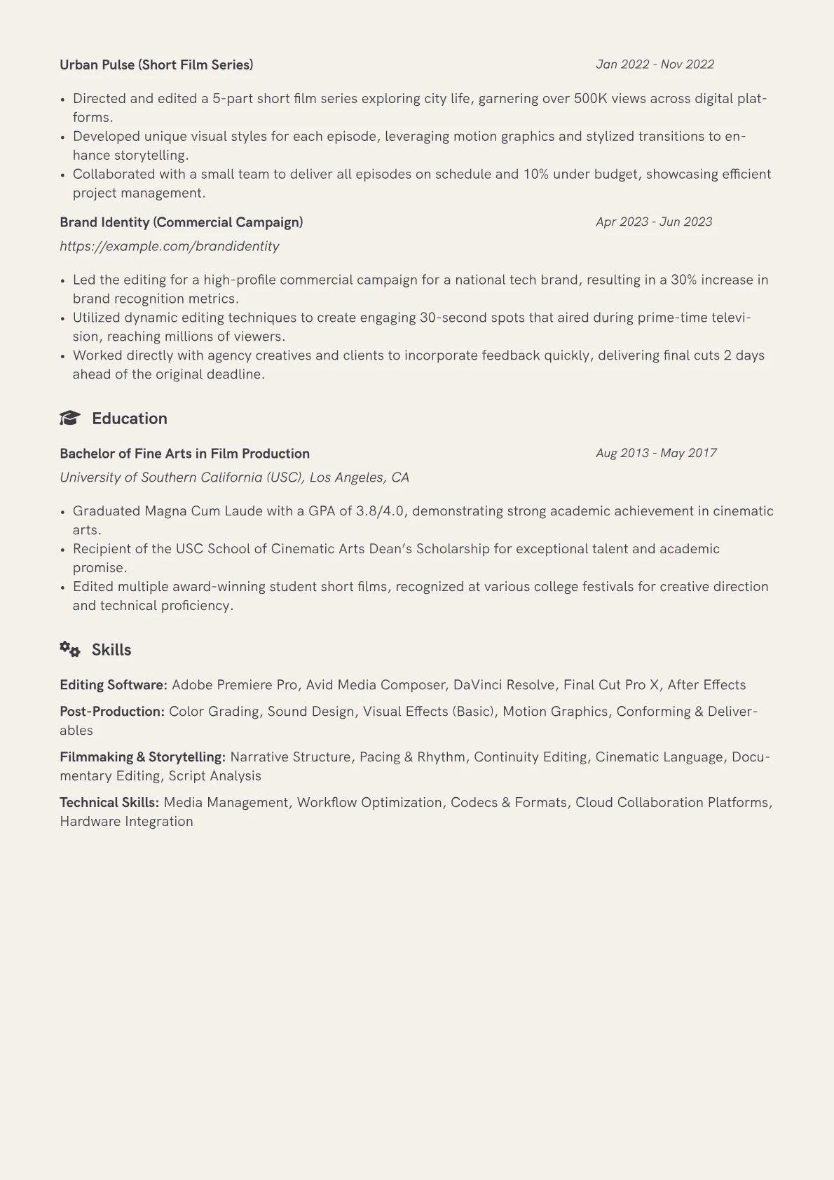 This example CV excels by concretely quantifying accomplishments. Instead of general descriptions, it highlights "Edited three short films recognized at national festivals, reaching over 500,000 online viewers." Skills are logically grouped, distinguishing primary editing software from technical competencies like VFX integration or basic sound mixing, making expertise immediately clear. Certifications such as "Adobe Certified Expert – Premiere Pro" are prominently featured, alongside a detailed list of codecs and camera formats mastered, underscoring specialized technical knowledge vital to the role.