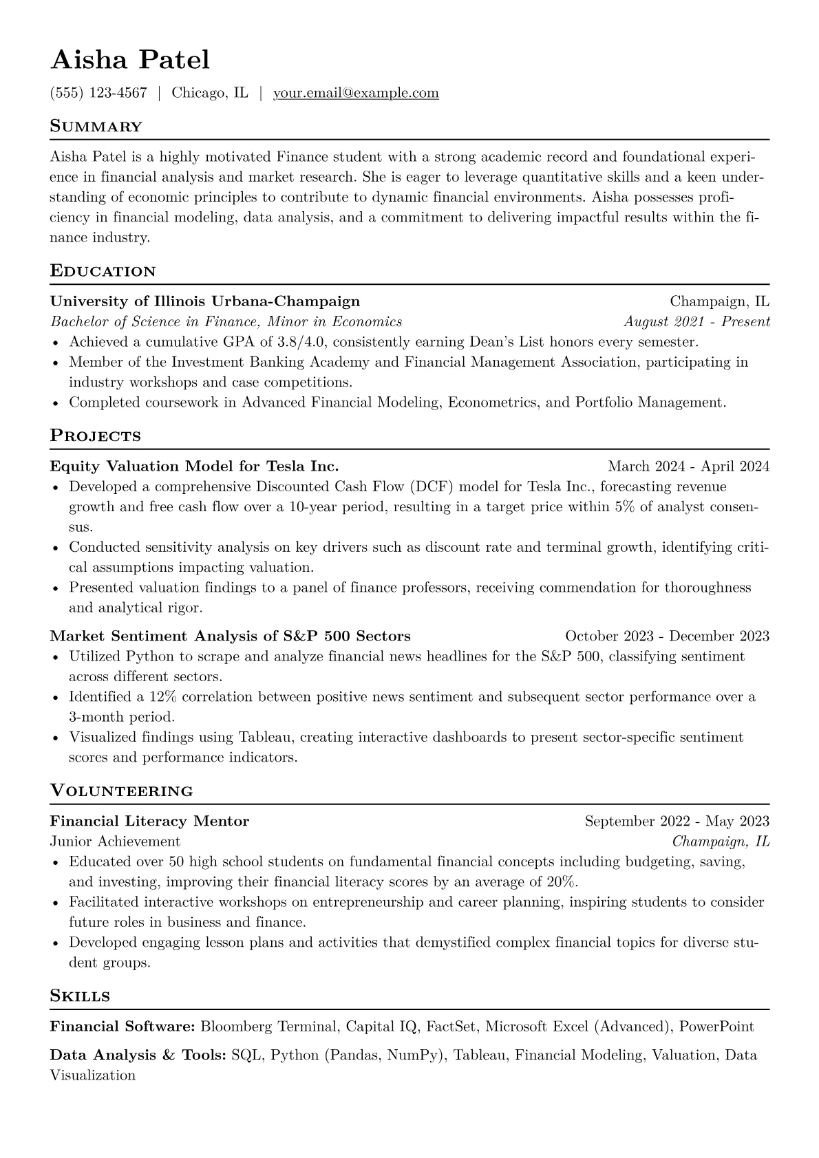 For aspiring finance professionals, a compelling resume showcases more than just academic grades; it highlights tangible analytical aptitude and practical application. Hiring managers evaluating finance student resumes seek concrete evidence of quantitative skills, financial literacy, and meticulous attention to detail. This includes internships involving financial modeling, valuation, or market research, alongside relevant coursework demonstrating proficiency in areas like corporate finance, econometrics, or investment analysis. Specific achievements should detail contributions to projects, perhaps managing a simulated portfolio, conducting DCF analyses, or developing financial reports. Familiarity with Bloomberg Terminal, financial statements analysis, and advanced Excel functions like pivot tables and VBA are highly valued, often preferred over generic academic accolades.