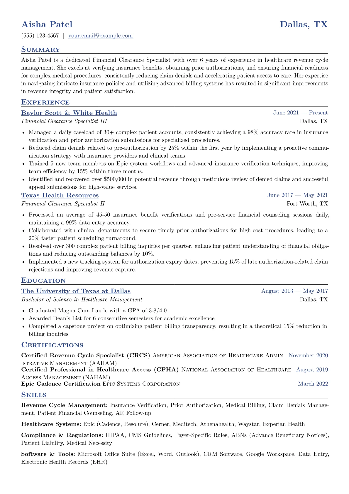 This template was built with JobSprout and can be remixed to create your own tailored Financial Clearance Specialist resume. Ensure your version highlights specific contributions to financial integrity and operational streamlining within your career.