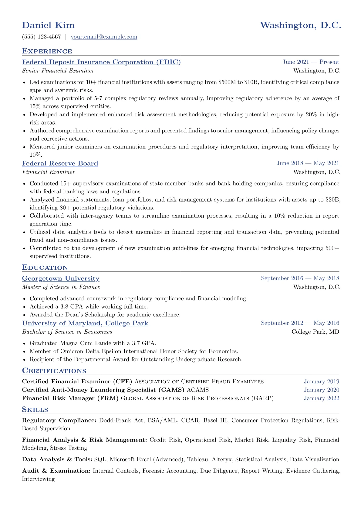A strong Financial Examiner resume for government roles emphasizes rigorous analytical skills, an in-depth understanding of regulatory frameworks, and unwavering attention to detail. Hiring managers in this sector prioritize candidates who demonstrate experience with public sector auditing standards, compliance protocols, and a commitment to fiscal integrity. The unique challenge lies in showcasing the ability to navigate complex government regulations while maintaining public trust and transparency.