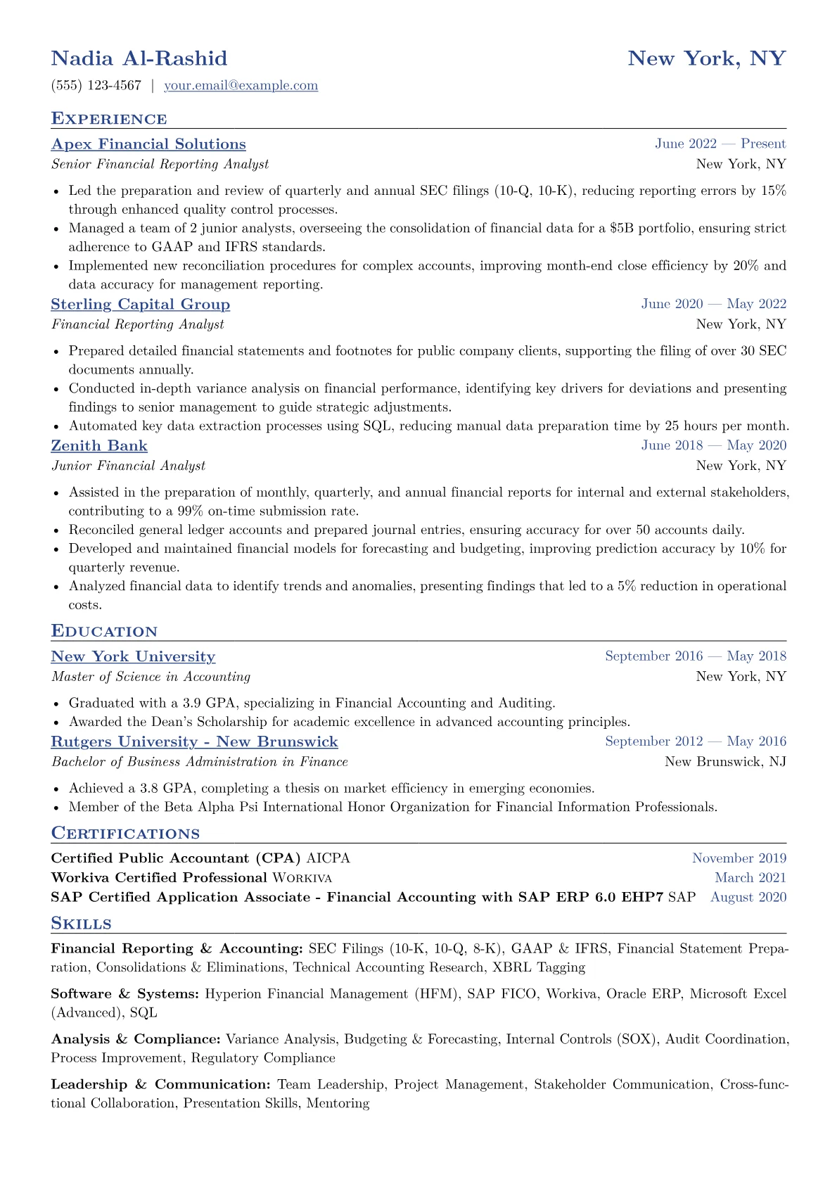 A strong Financial Reporting Analyst resume clearly demonstrates meticulous accuracy, deep regulatory knowledge, and robust analytical prowess. Hiring managers in Finance & Banking seek candidates with proven experience in GAAP/IFRS, SEC compliance, and financial statement preparation, often demanding proficiency in advanced data analysis and reporting tools. The unique challenge lies in balancing precision with tight deadlines and navigating complex, evolving financial regulations.