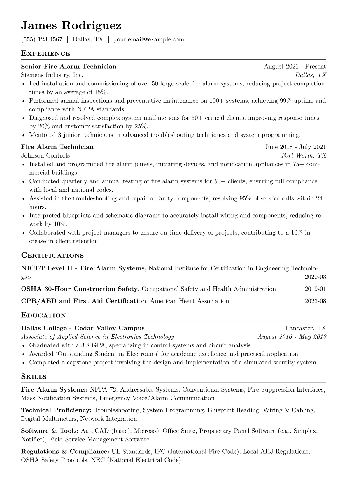 For a mid-level Fire Alarm Technician in Manufacturing, hiring managers seek more than just technical ability; they prioritize a deep understanding of safety regulations, NFPA codes, and the unique operational demands of a production environment. A strong resume highlights meticulous diagnostic skills, preventative maintenance expertise, and a proactive approach to ensuring uninterrupted system functionality amidst complex machinery. It effectively communicates a commitment to safety compliance and minimal production downtime.