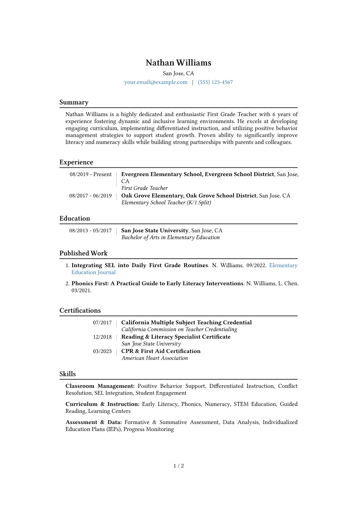 This template was built with JobSprout and can be remixed to create your own tailored First Grade Teacher resume. It provides a solid foundation for presenting your valuable teaching experience.