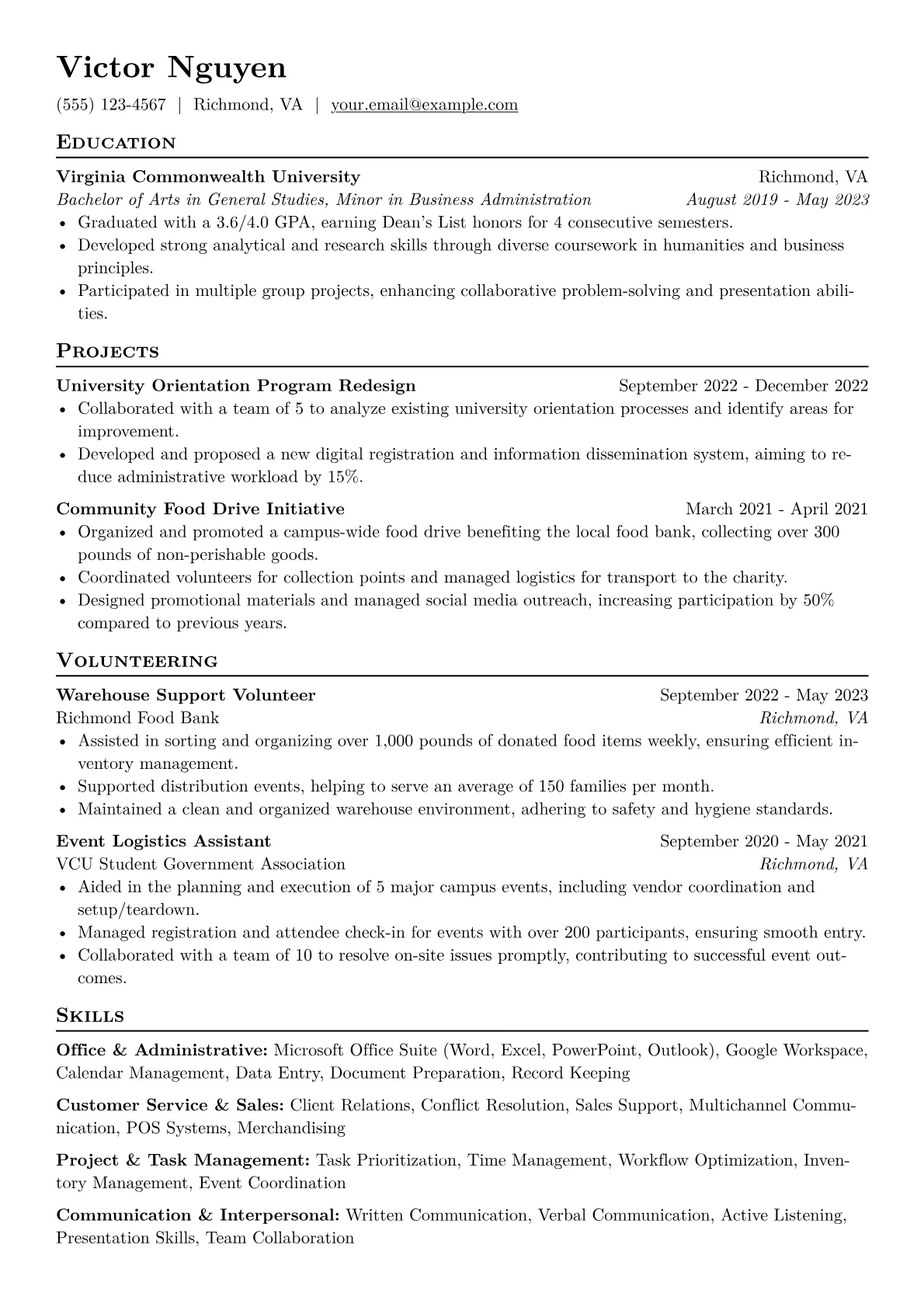 This example resume excels by prioritizing quantifiable achievements from internships, academic projects, and volunteer work, transforming non-traditional experiences into valuable assets. It strategically groups relevant certifications and skills, allowing recruiters to quickly identify key competencies vital for a variety of roles within "Other" sectors. The layout effectively conveys a proactive and results-oriented mindset.