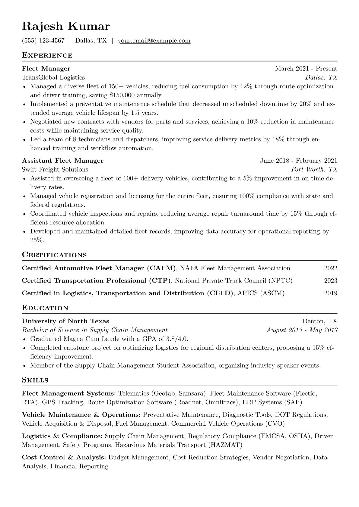 This template was built with JobSprout and can be remixed to create your own professional Fleet Manager resume.