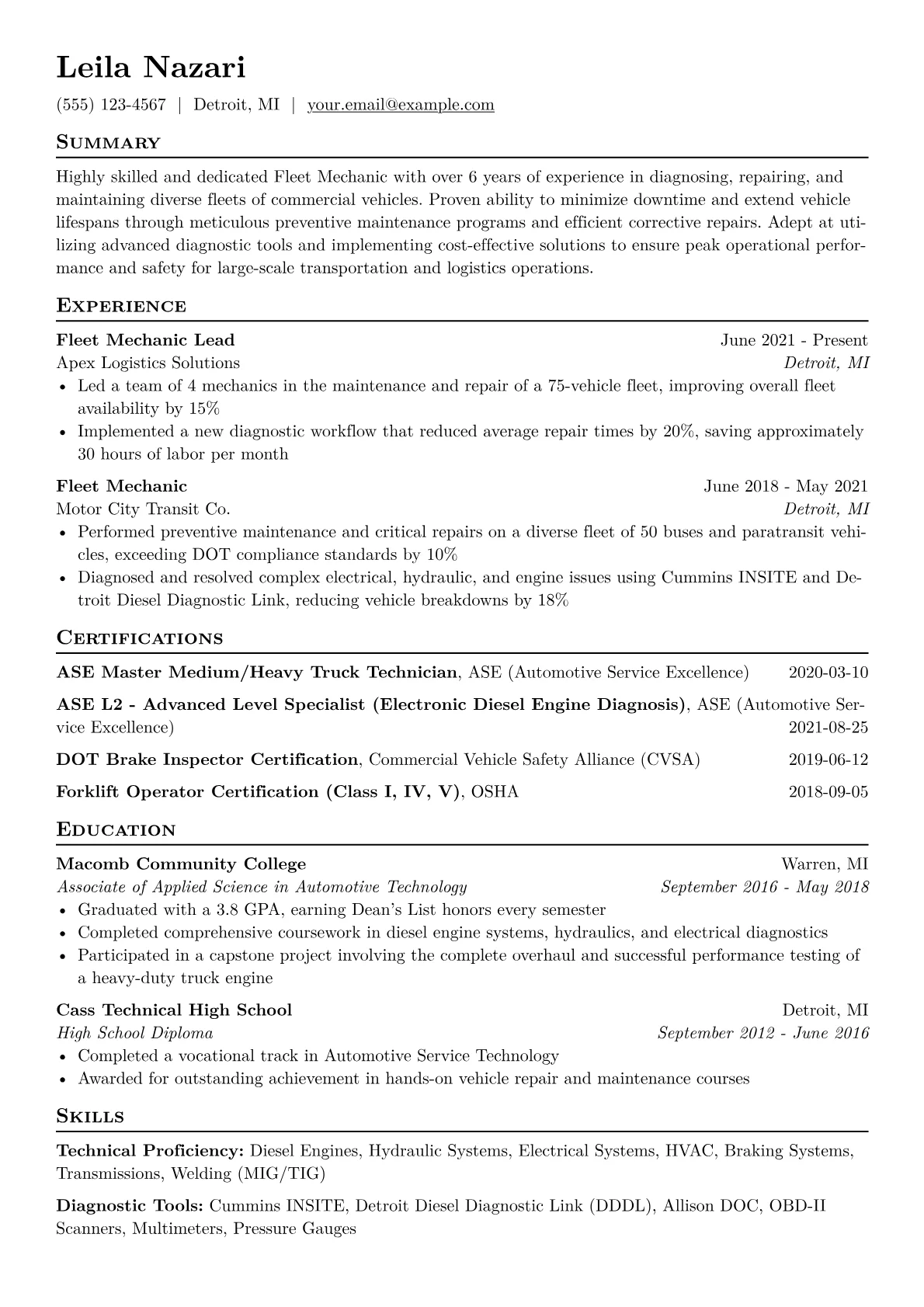 Hiring managers seeking a mid-level Fleet Mechanic in Manufacturing prioritize a resume demonstrating tangible impact on operational efficiency and safety. They look for specific achievements such as reducing vehicle downtime, optimizing preventative maintenance schedules, and efficiently diagnosing complex mechanical or electrical faults across diverse industrial fleets. Key terminology like hydraulic system repair, diesel engine diagnostics, DOT compliance, and certifications in specific equipment (e.g., forklift operation, ASE certifications for heavy-duty vehicles) are critical for showcasing relevant expertise.