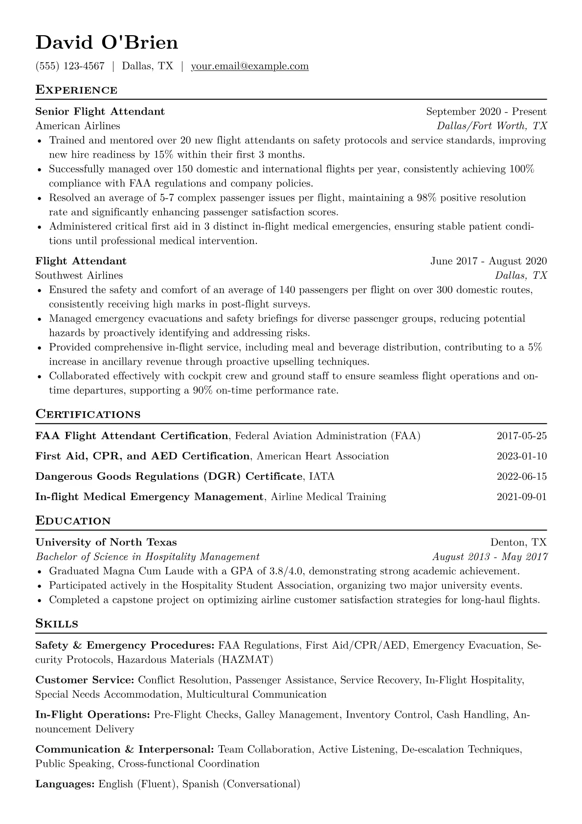 A compelling Flight Attendant resume for a mid-level professional (3-7 years) must prioritize safety, service excellence, and adaptability. Hiring managers specifically seek evidence of calm under pressure during emergency situations, adherence to FAA Part 121 operations, and strong customer de-escalation skills. Nuances include showcasing proactive cabin safety checks, efficient boarding and deplaning protocols, and maintaining passenger comfort across diverse cultural backgrounds. Key achievements should highlight successful incident resolution, multilingual communication with passengers, and maintaining regulatory compliance. Certifications like FAA cabin crew certification, CPR/AED, and specific aircraft type qualifications are essential.