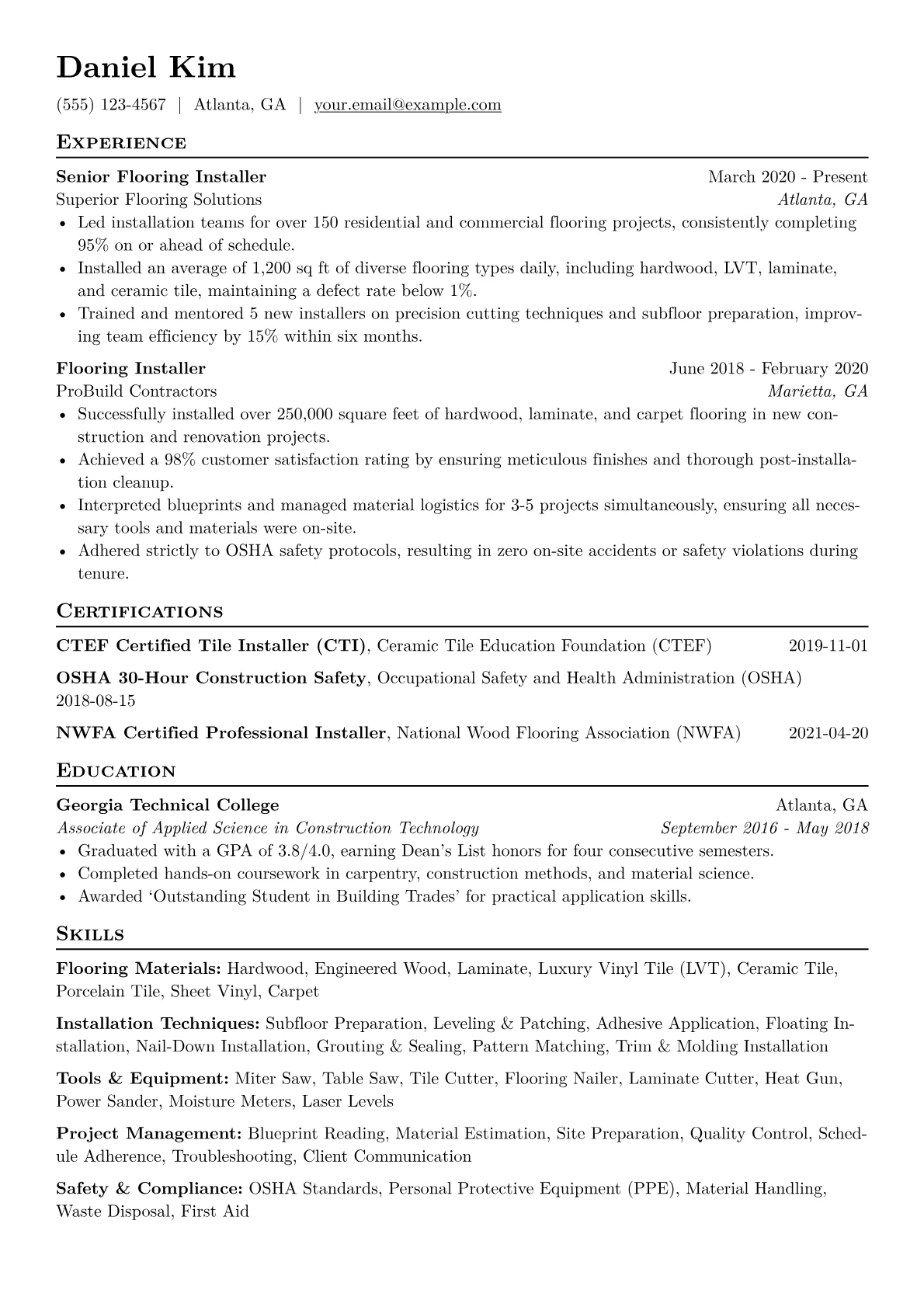 This example effectively showcases these qualities through quantified achievements, detailing project scope and impact, such as "installed X square feet" or "completed Y projects ahead of schedule." Its clear skills grouping highlights specific installation techniques, material handling, and essential safety certifications relevant to a manufacturing environment. This structure allows hiring managers to quickly grasp the candidate's capabilities and value.