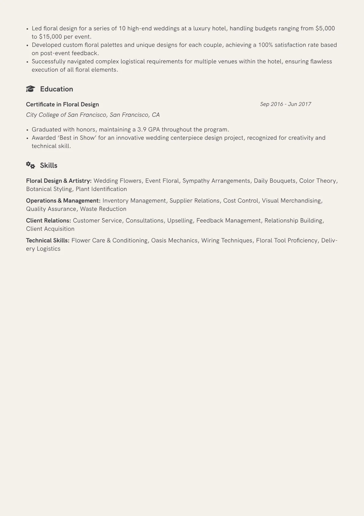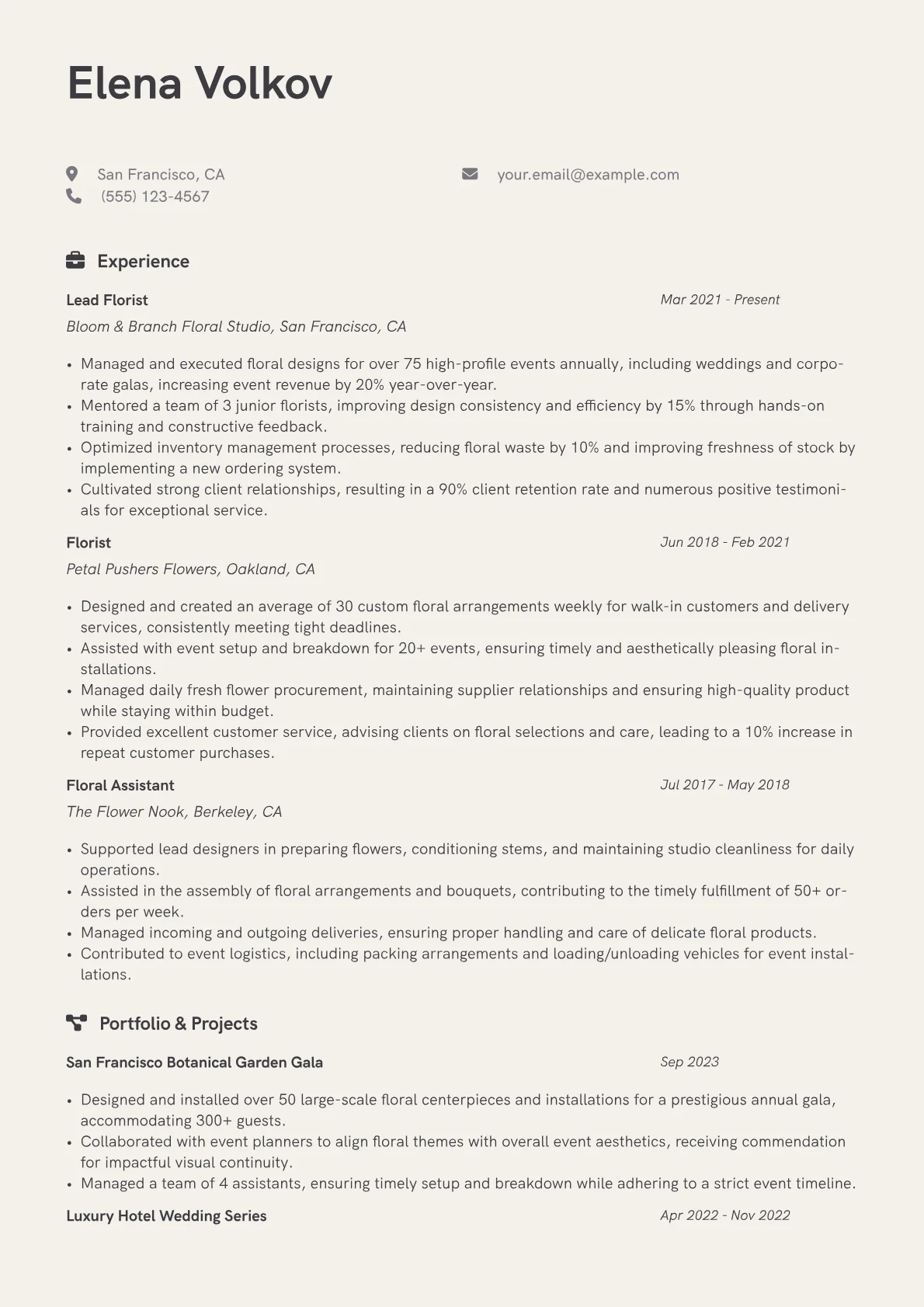 This template was built with JobSprout and can be remixed to create your own version, helping you craft a compelling resume that truly reflects your floral artistry and professional capabilities.